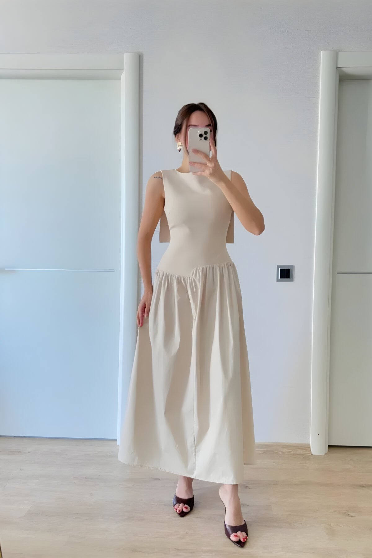 RAWEA FASHİONفستان طويل من الكريب باللون البيج بتصميم بنس مجنحة خلفية