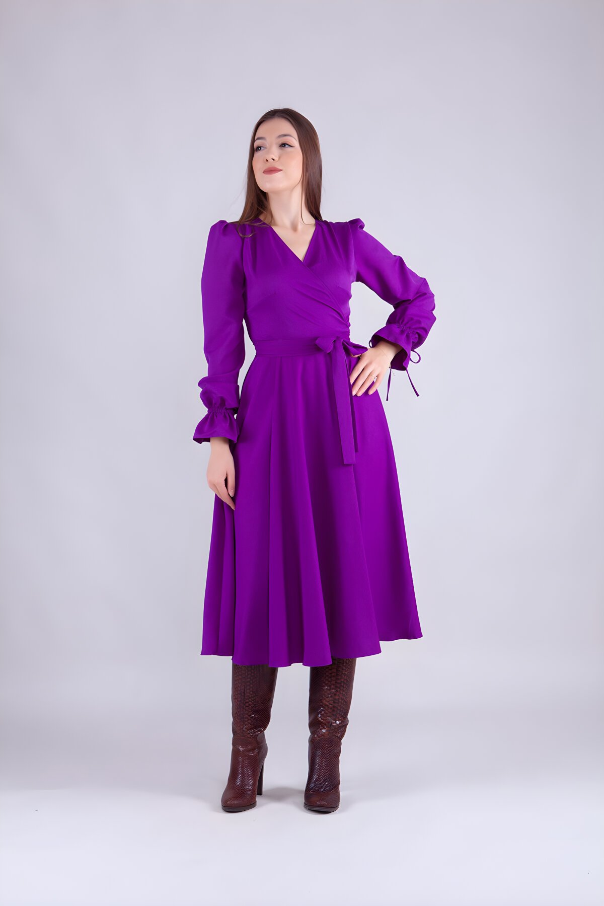 فستان ميدي بنفسجي بأكمام طويلة وياقة متقاطعة