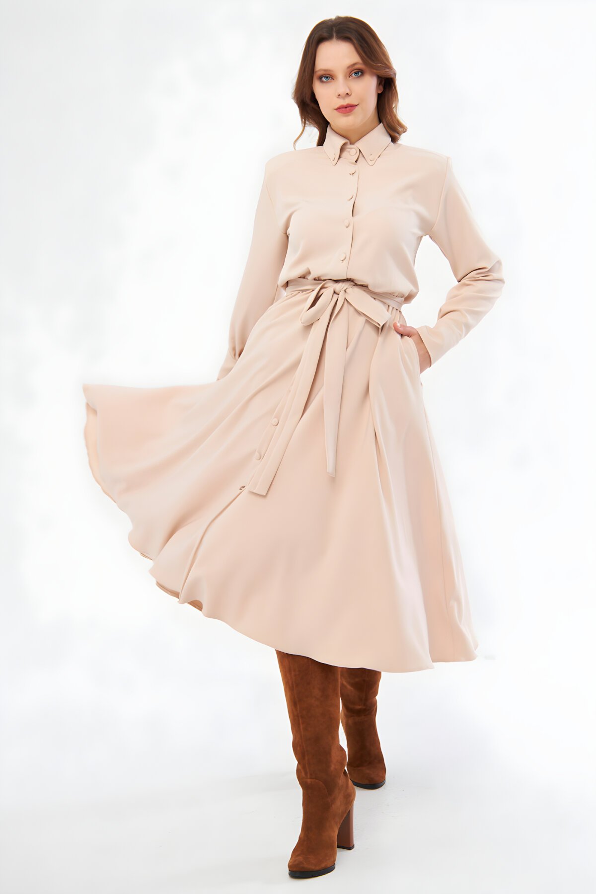 تسوقي الآن فستان ميدي ستايل قميص عصري من MegaButik. هذا الفستان الأنيق باللون الكريمي، يتميز بأكمام طويلة وخصر مطاطي مريح، ومزود بحزام قابل للتعديل لتحديد الخصر. مثالي لإطلالاتك اليومية والمناسبات الخفيفة. اكتشفي تشكيلة Bidoluelbise الكاملة واستمتعي بأفضل الأسعار وأحدث التصاميم لعام 2024.