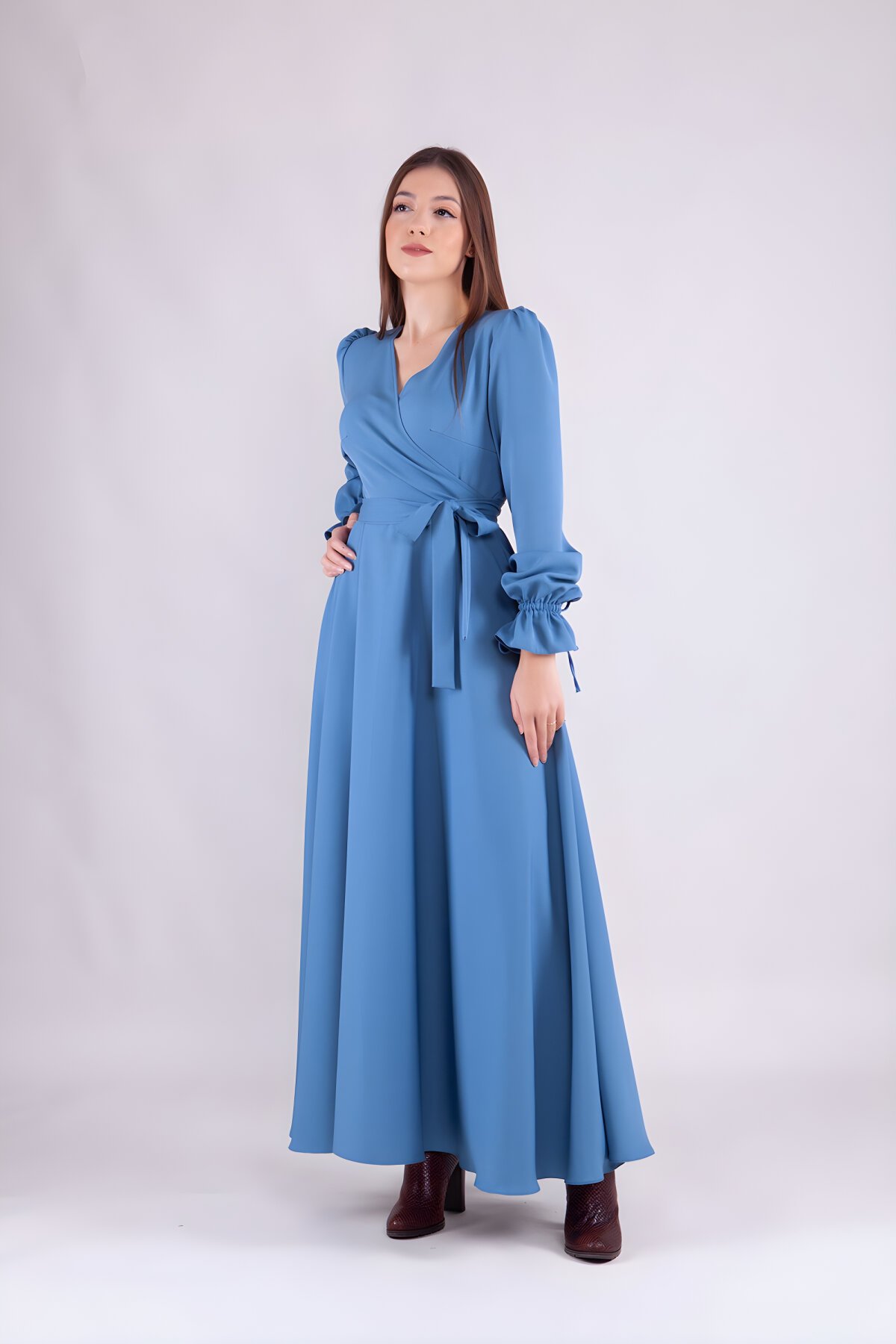 فستان محتشم أزرق كم طويل بتصميم الياقة الكرووازيه