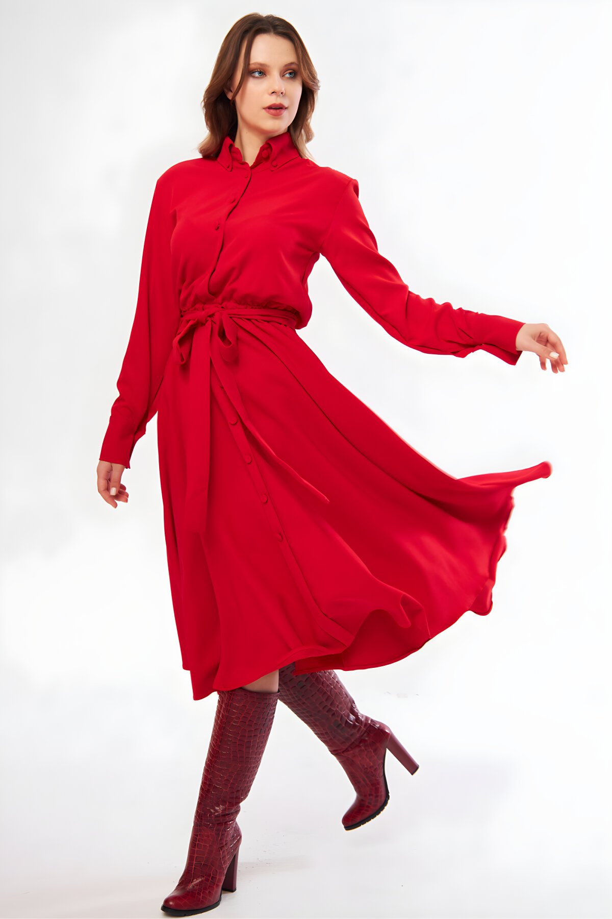 فستان قميص ميدي باللون الأحمر بأكمام طويلة مزين بحزام وجيوب