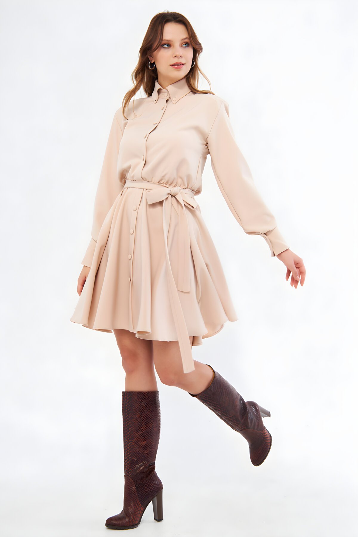 Bidoluelbiseفستان قميص قصير كريمي منسوج بأكمام طويلة، مع حزام وخصر مطاطي
