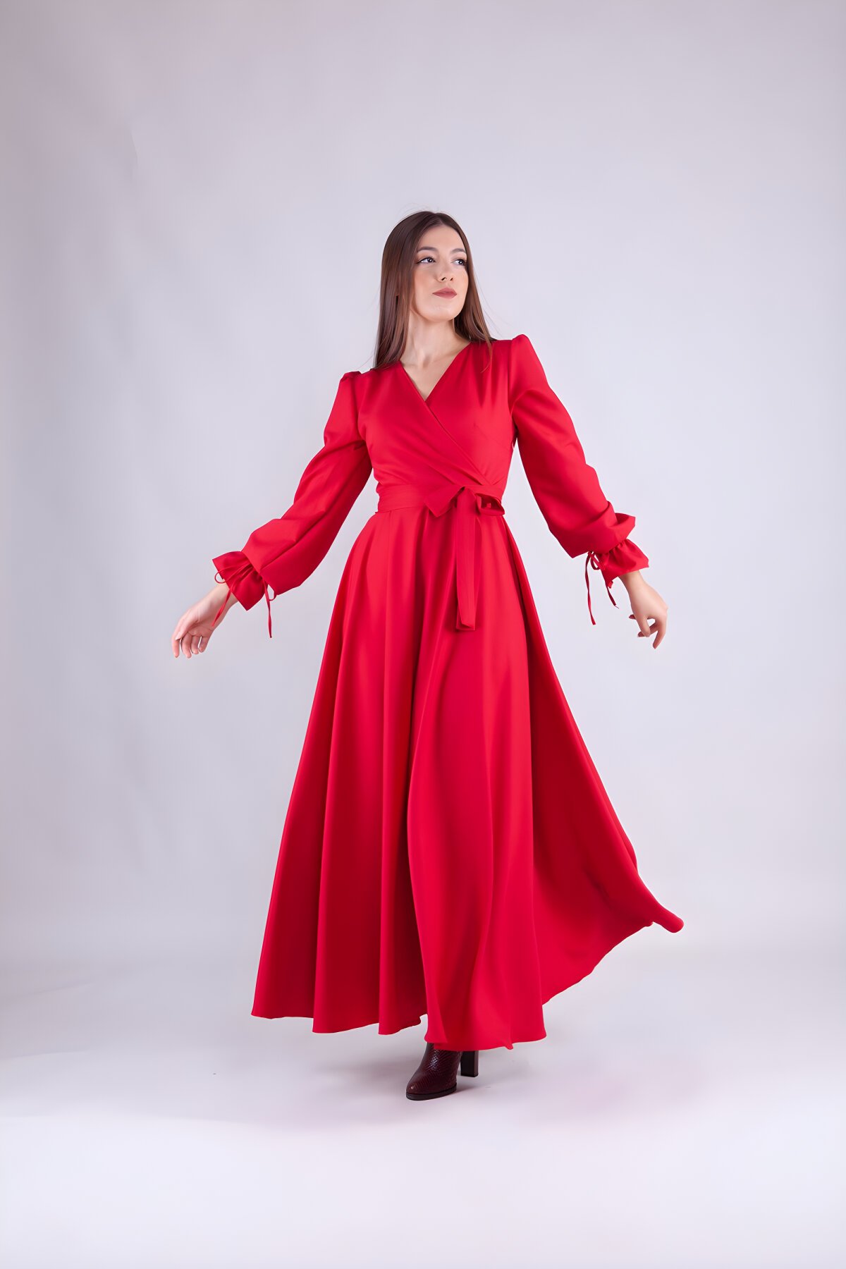 تألقي في مناسباتك الخاصة مع مجموعة MegaButik الجديدة. اكتشفي فستان سهرة محتشم باللون الأحمر بتصميم أنيق يتميز بأكمام طويلة وياقة متقاطعة (كروفاز). هذا الفستان الفاخر من Bidoluelbise يضمن لك إطلالة جريئة ومميزة بكل أناقة.