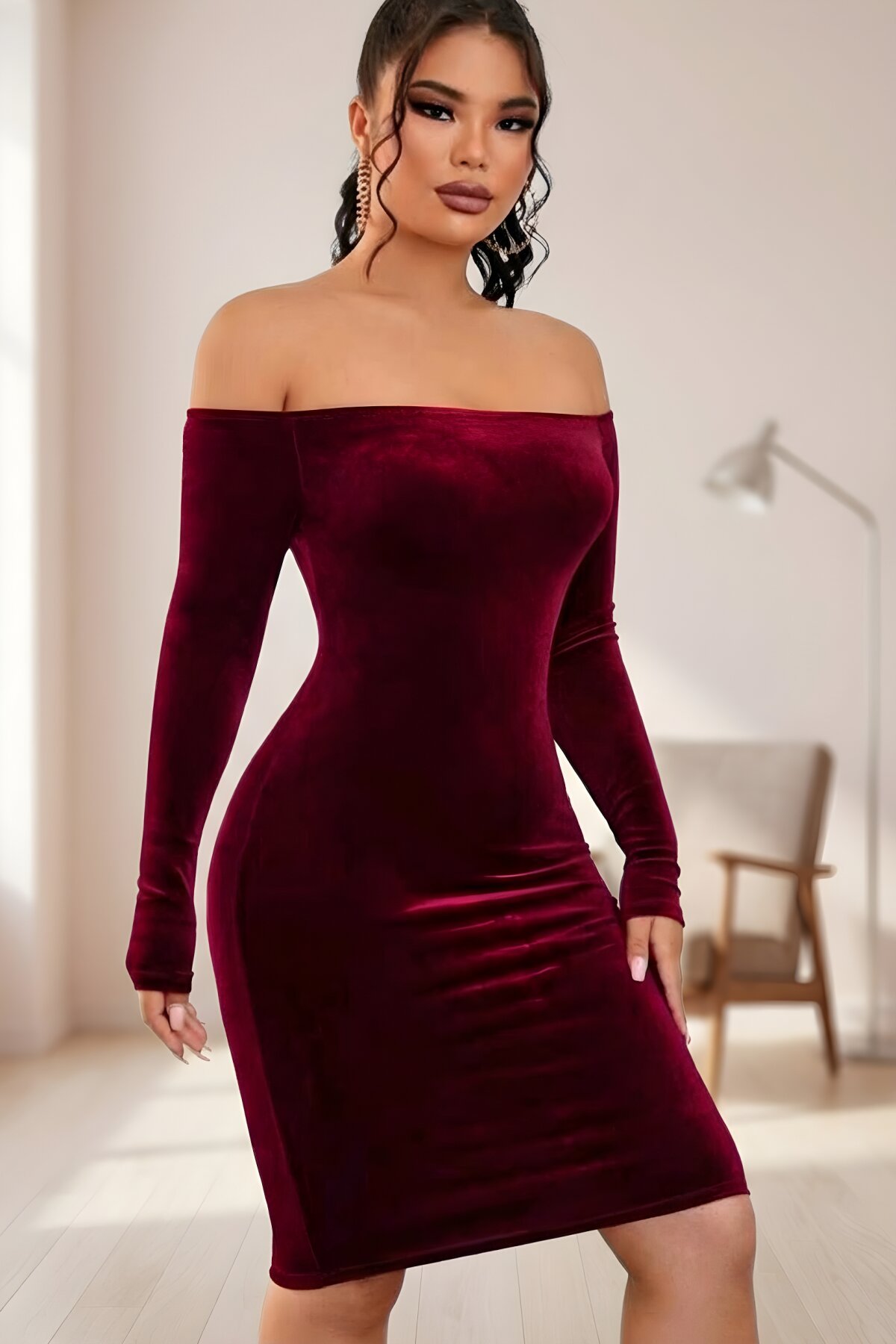Charangoفستان سهرة مخملي ضيق بلون بورغندي مع أكمام طويلة وياقة مادونا الجذابة