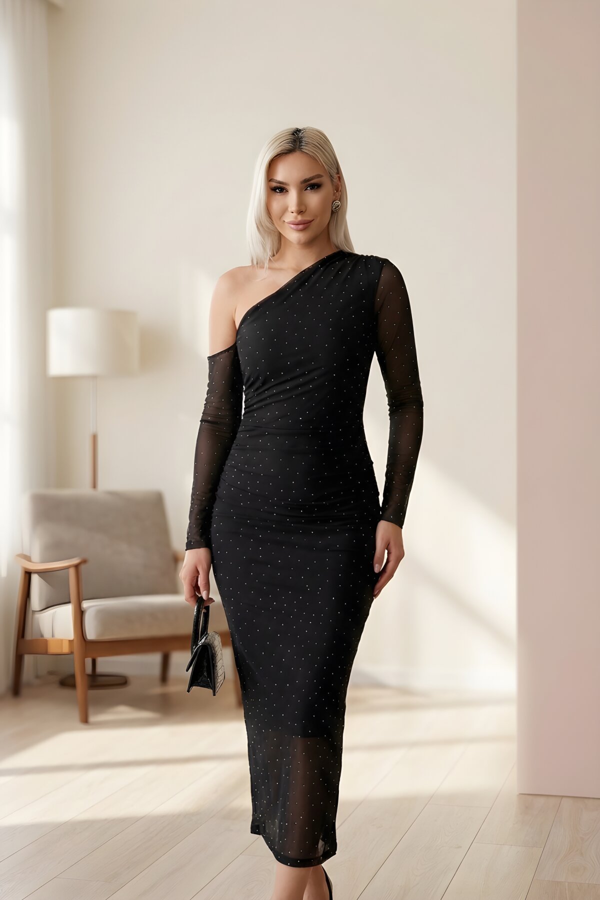 MOZENAفستان سهرة طويل باللون الأسود بكتف واحد مع تفاصيل درابيه ومرصع بالأحجار