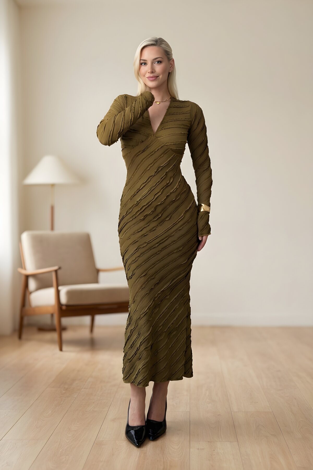 MOZENAفستان طويل باللون الأخ ضر بياقة V وتفاصيل الخياطة المعكوسة