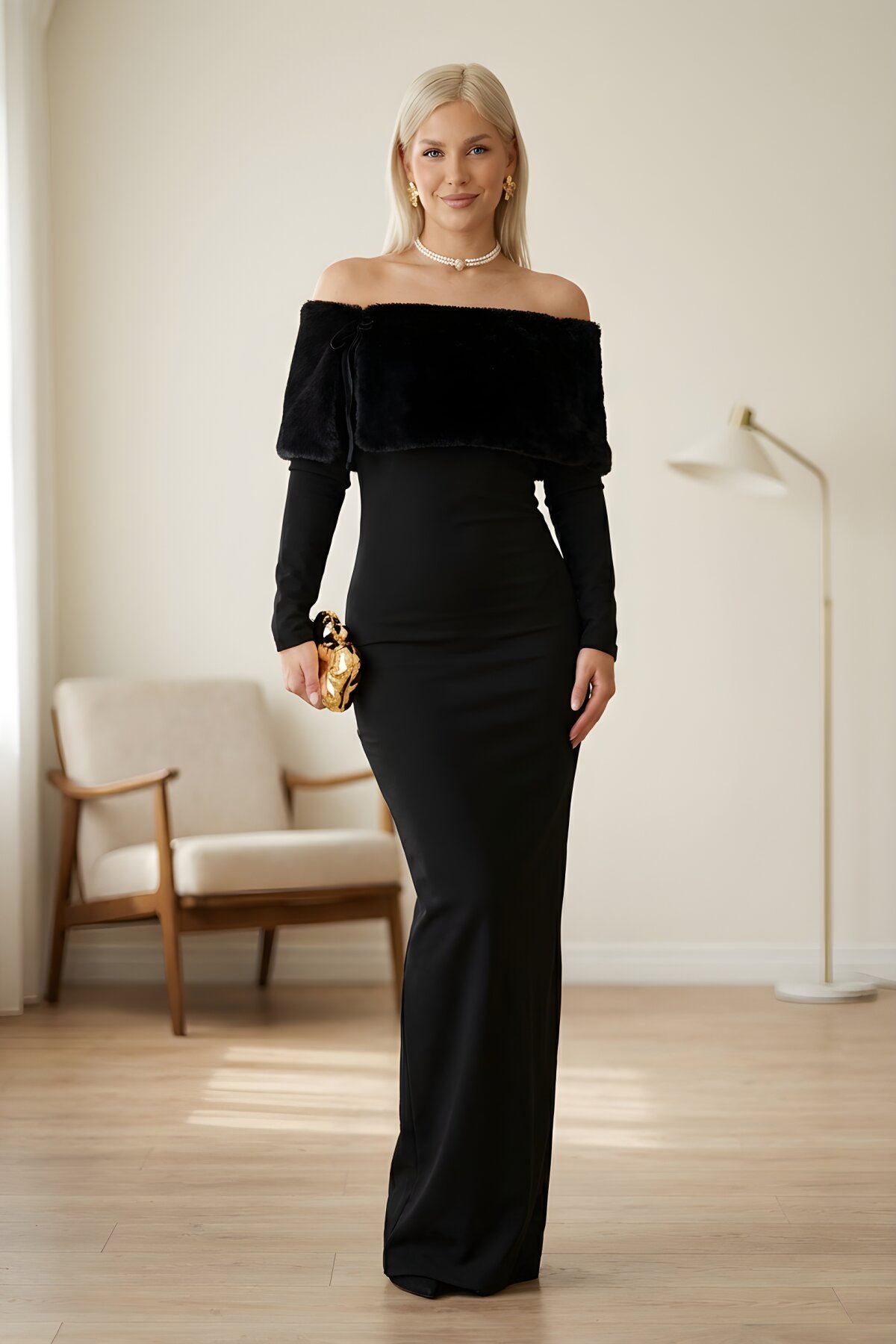 MOZENAفستان طويل بدون حمالات باللون الأسود مزين بتفاصيل الفرو الصناعي