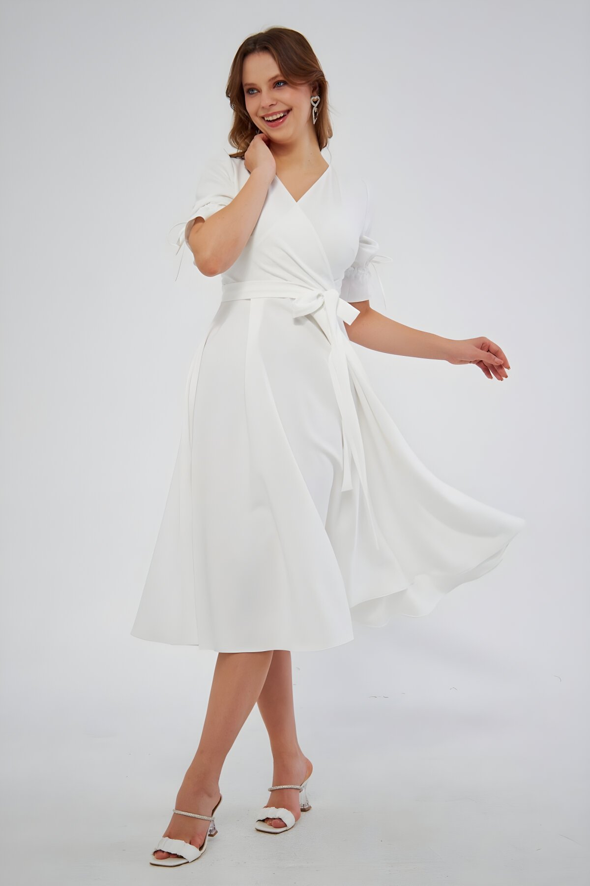 فستان ميدي أبيض بأكمام قصيرة مكشكشة وياقة كرووازيه، مزود بحزام خصر