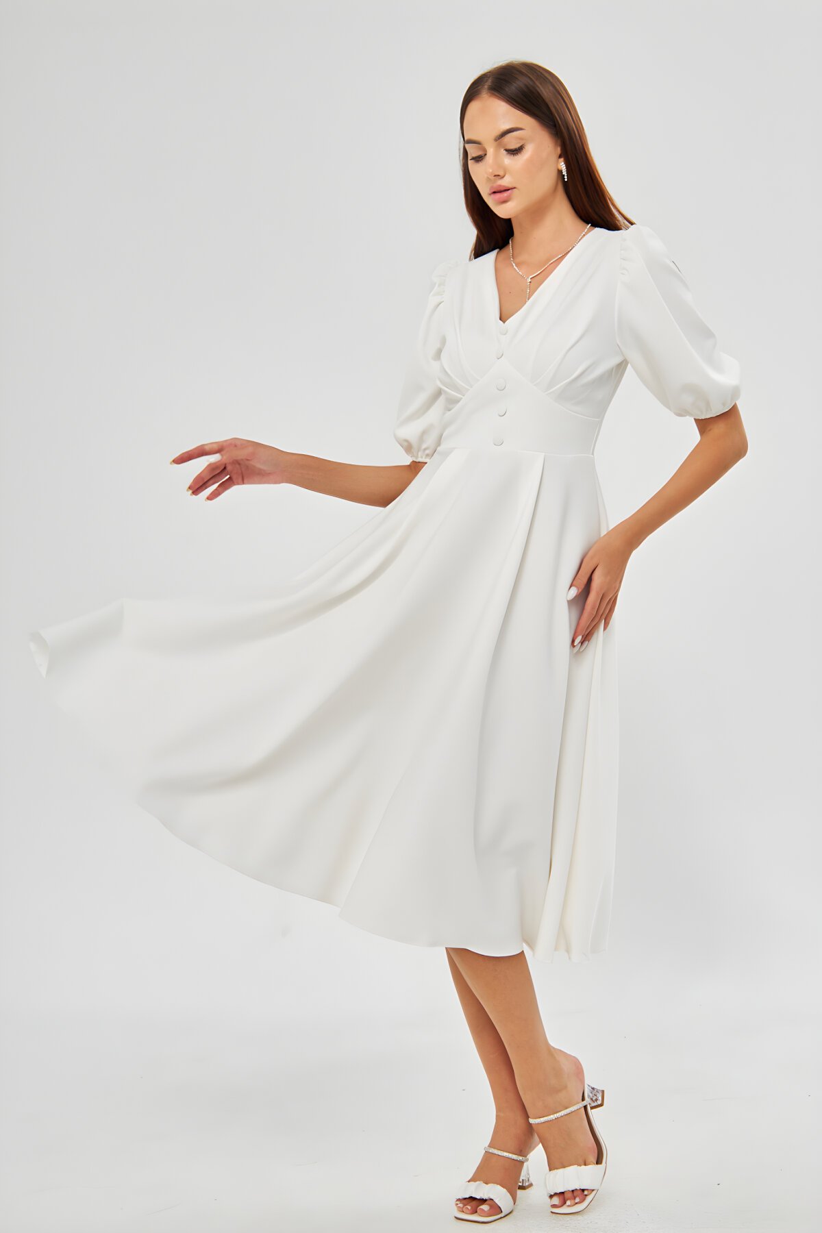 Bidoluelbise فستان سهرة ميدي باللون الأبيض بأكمام منفوخة وياقة V وتفاصيل حزام كورسيه وكسرات صدر