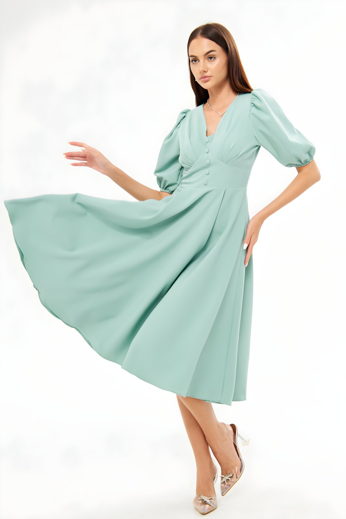 Bidoluelbiseفستان سهرة ميدي باللون الأخضر النعناعي، يتميز بأكمام بالون وياقة V وتفاصيل حزام الكورساج
