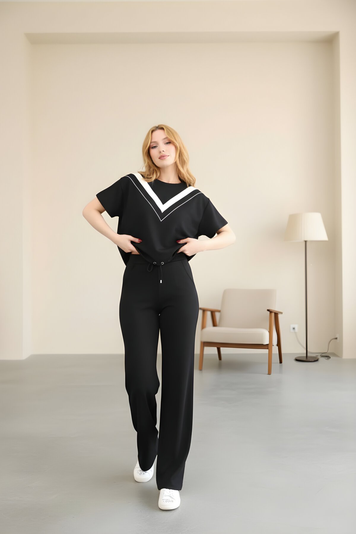 RAWEA FASHİON طقم قطعتين ناعم الملمس باللون الأسود من قماش المودال بياقة مستديرة وتفاصيل مقسمة