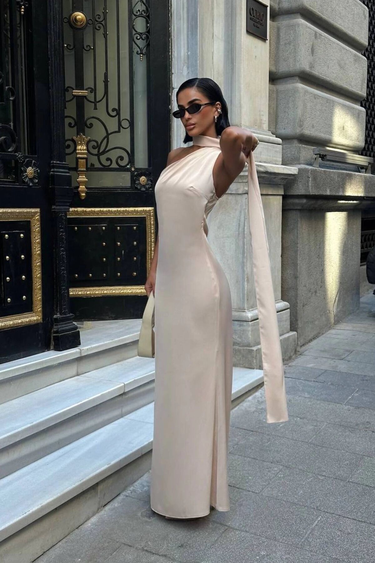 تألقي في مناسباتك الكبرى مع فستان سهرة طويل وفاخر باللون البيج من الساتان، الذي يتميز بتصميم عصري بكتف واحد وتفاصيل شال أنيقة. هذا الفستان المميز من ماركة VİSKALİ يجمع بين الفخامة والجرأة. تسوقيه الآن حصرياً عبر MegaButik لطلة لا تُنسى.
