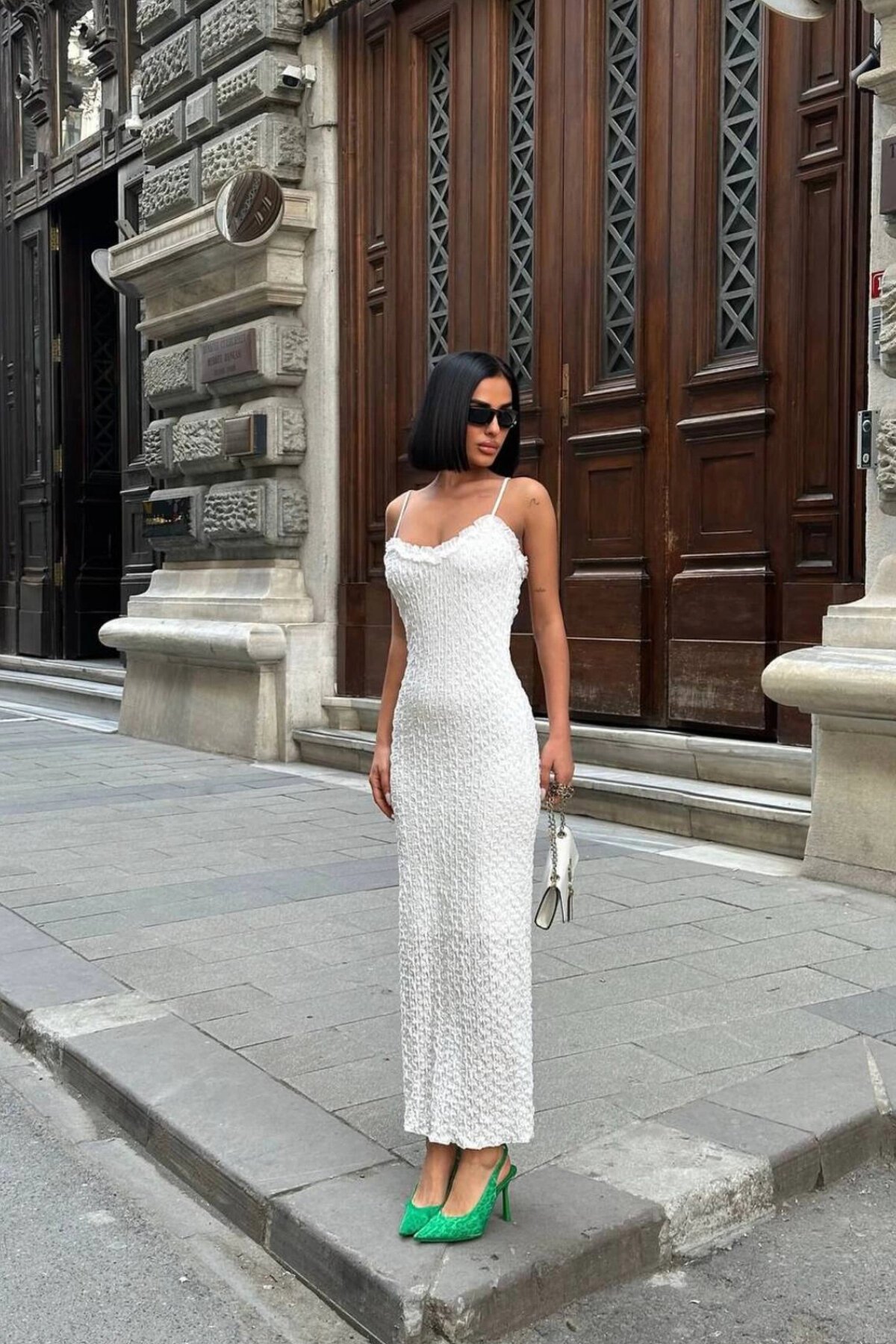 VİSKALİ فستان طويل أبيض Textura بحمالات وتفاصيل دانتيل جبير