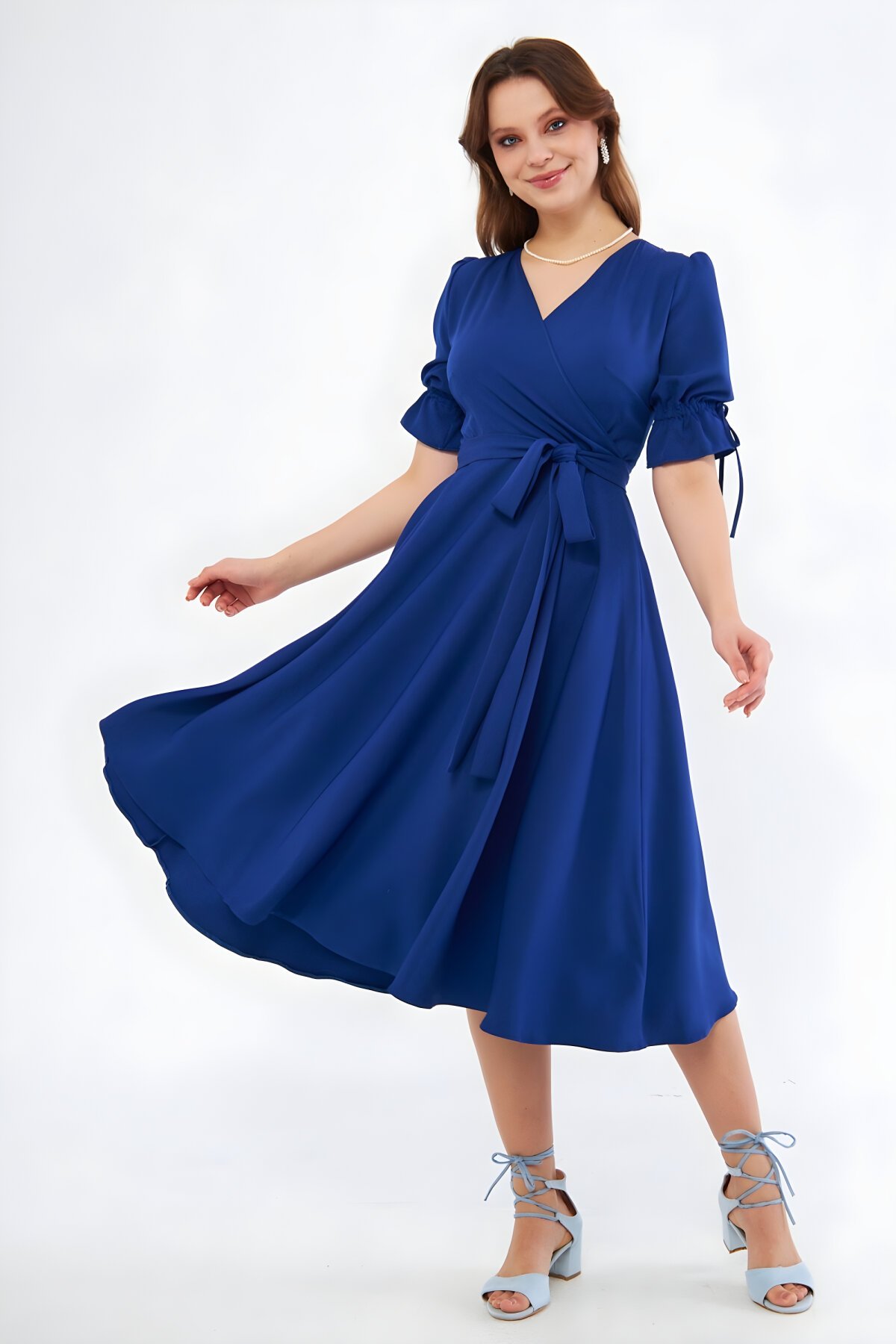 Bidoluelbise فستان ميدي قصير الأكمام باللون الأزرق الساكس مع ياقة لف وتفاصيل كشكشة وحزام