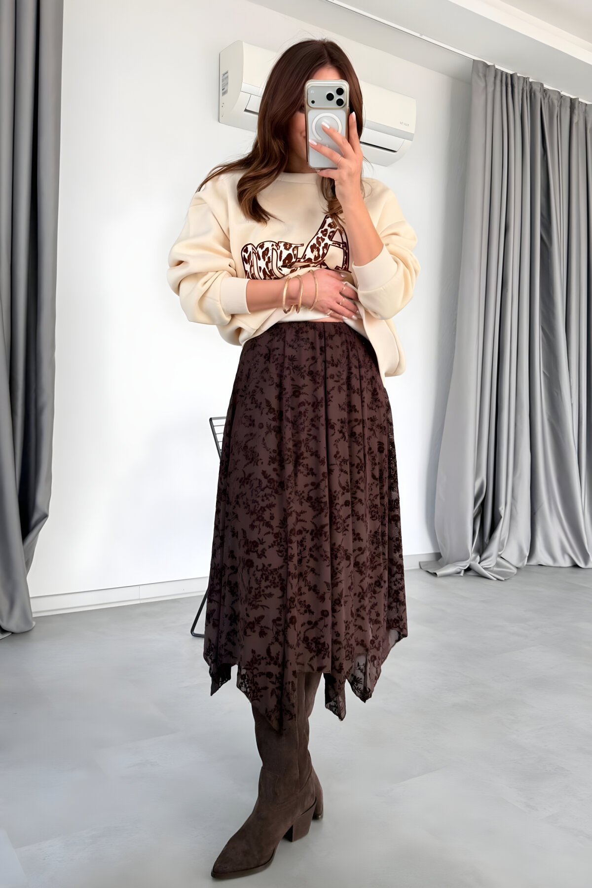 MOZENAتنورة دانتيل ميدي باللون البني بتصميم غير متماثل وتطريز أنيق