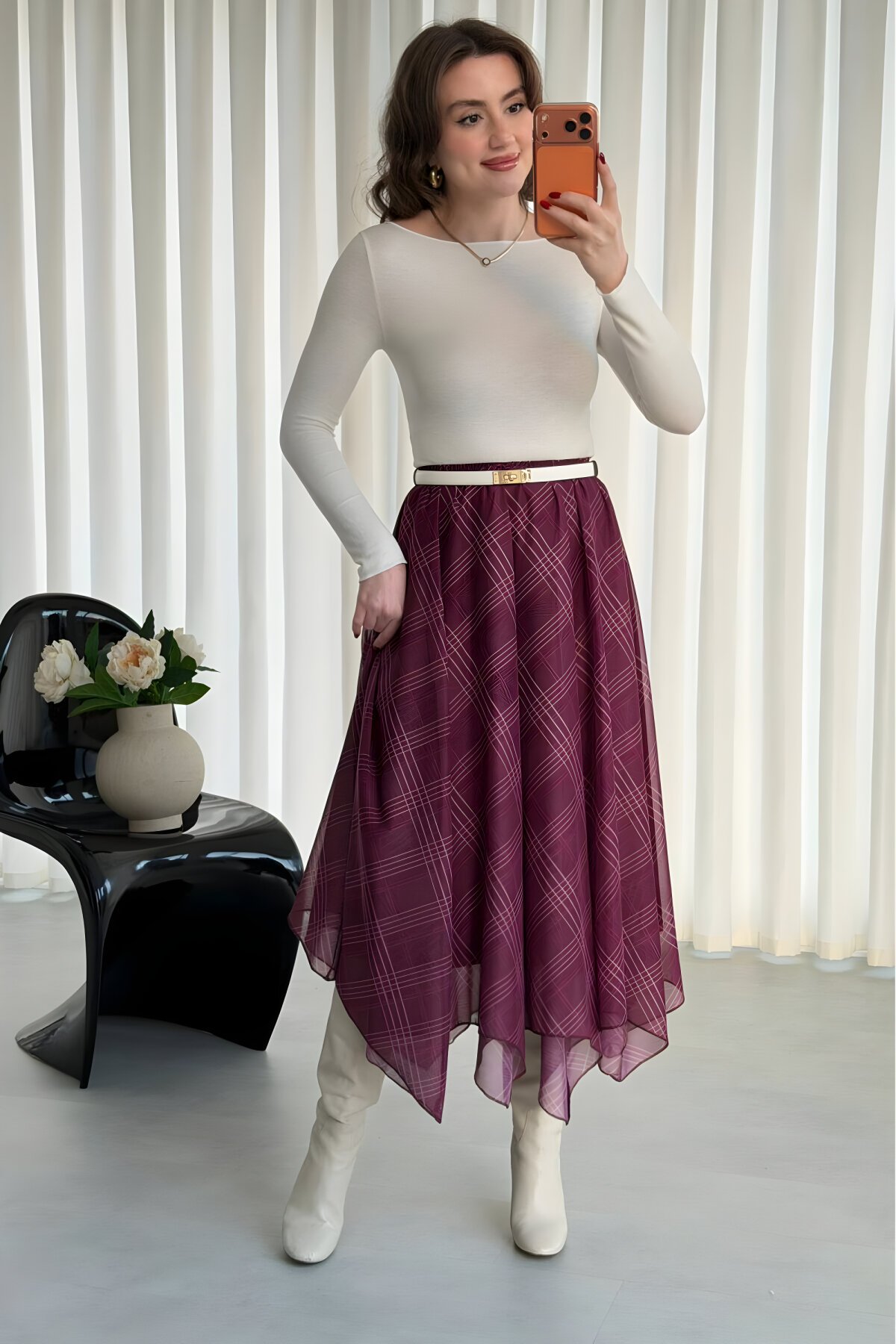 MOZENAتنورة ميدي بقصّة غير متماثلة ونقش كاروهات باللون العنابي