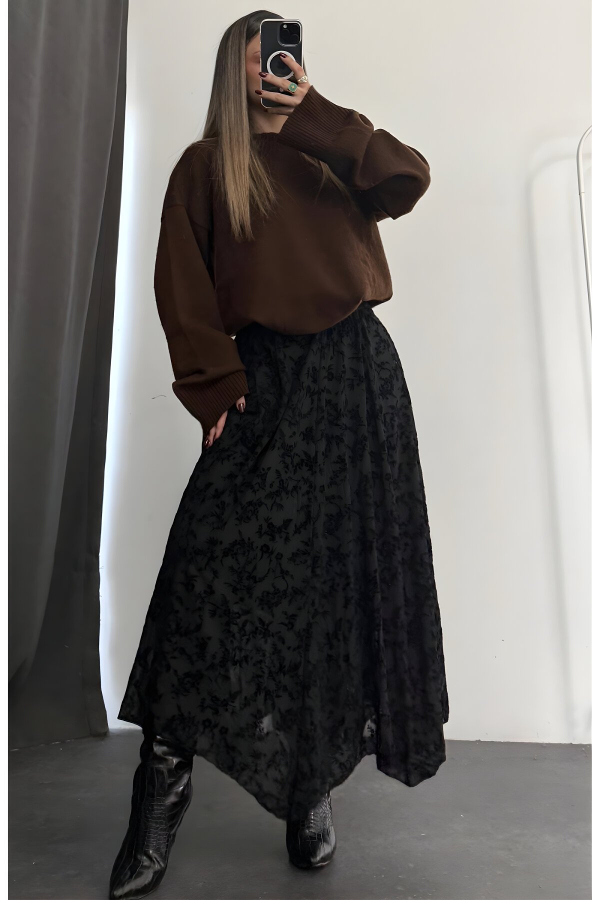 هل تبحثين عن إطلالة جريئة وعصرية؟ اكتشفي تنورة MOZENA الطويلة المصنوعة من قماش التول والمصممة بنمط غير متماثل. تأتي باللون الأسود الأنيق ومزينة بالكامل بنقشات زهور ساحرة. تسوقي أحدث صيحات التنانير النسائية من MegaButik وتمتعي بالجودة والتصاميم الفريدة.