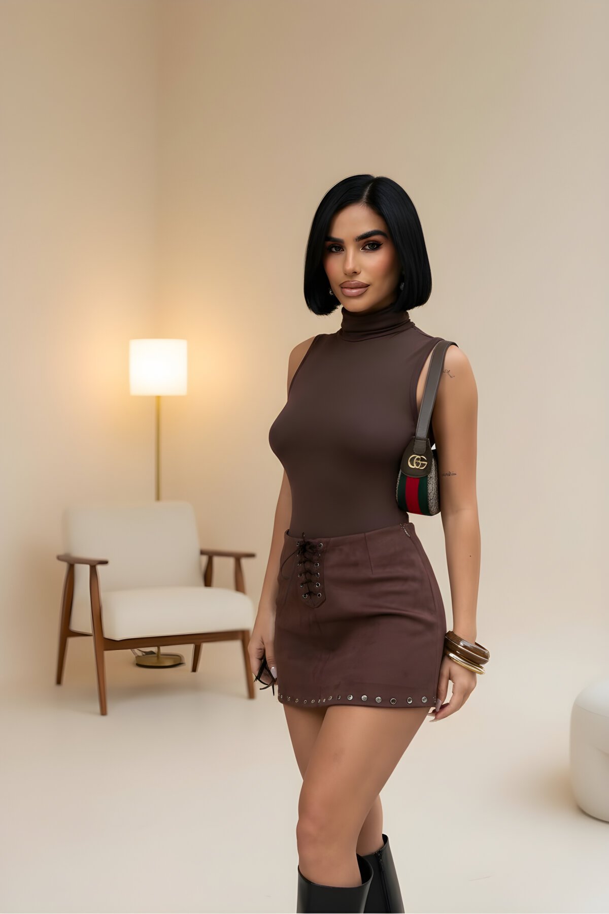 VİSKALİتنورة قصيرة من الشمواه البني، مزودة بتفاصيل عيون الطائر