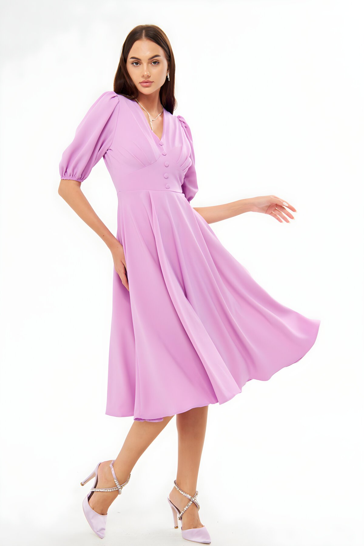 Step out in style with this stunning Lilac Midi Evening Dress, available exclusively at MegaButik. This fashionable Bidoluelbise design features on-trend Balloon Sleeves, a flattering V-Neckline, and an integrated Corset Belt Detail for the perfect silhouette. Find your dream dress for any special occasion today.