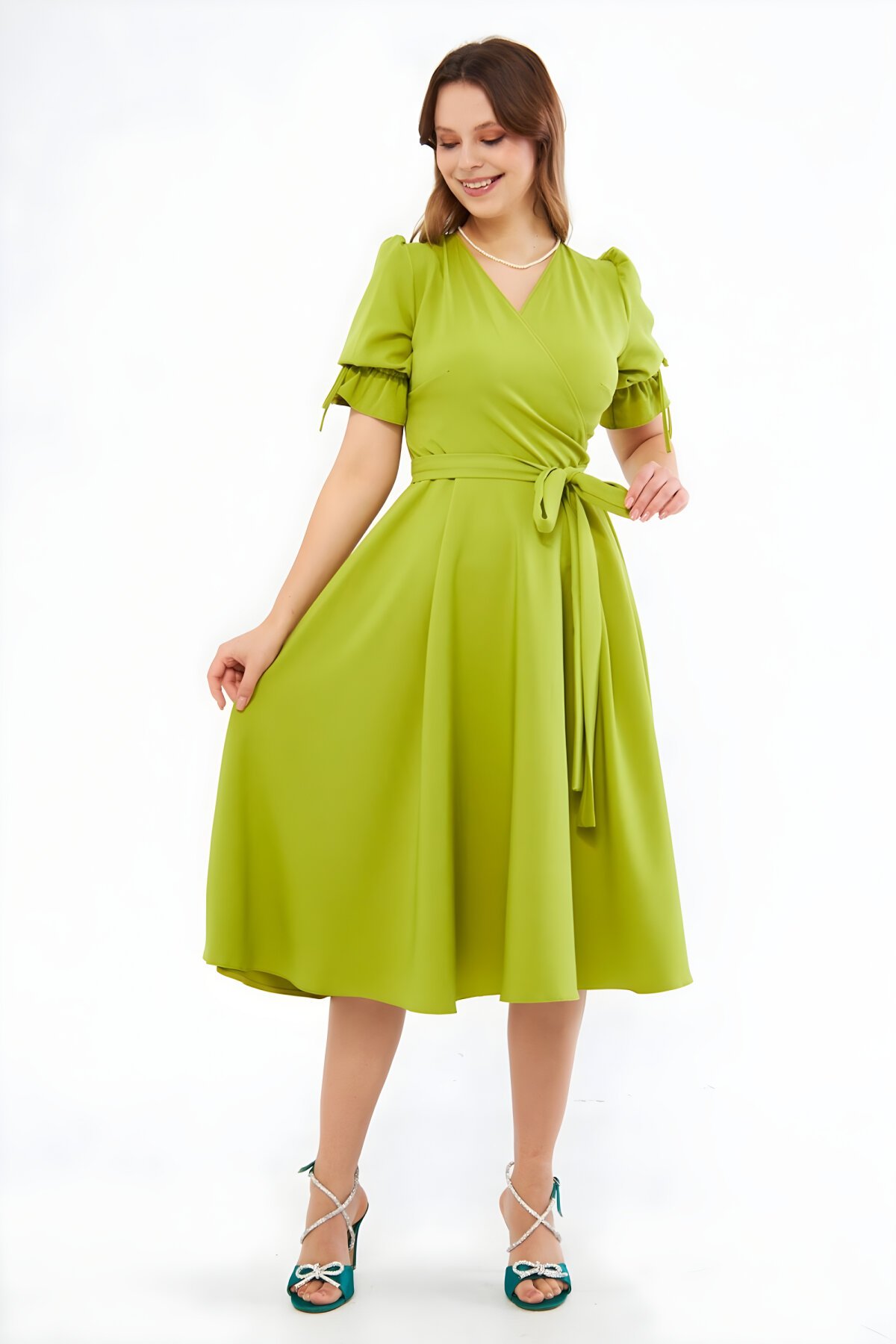 BidoluelbiseMidi Short-Sleeve Ruched Dress with Wrap Neck, Belt, and Elastic Detail in Pistachio Green