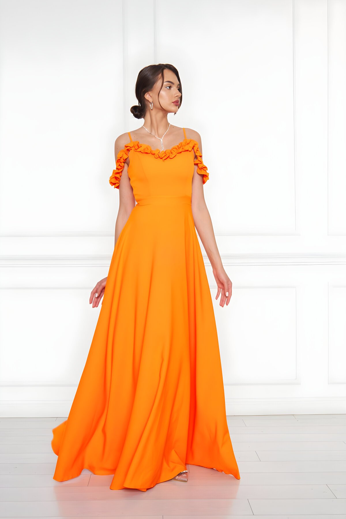 Discover the perfect look for your next special event with this stunning Orange Long Flared Evening Dress. The elegant Strapless design is complemented by Ruffle Detail and adjustable straps for a custom fit. Find this glamorous style and the latest Bidoluelbise collection available exclusively at MegaButik today for fast shipping and the best women's fashion.