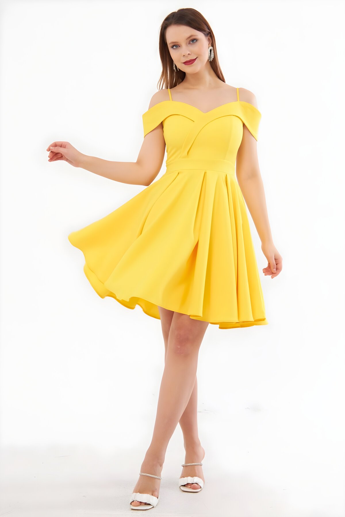 BidoluelbiseYellow Mini Evening Dress with Flared Pleated Skirt and Strappy Boat Neck Detail