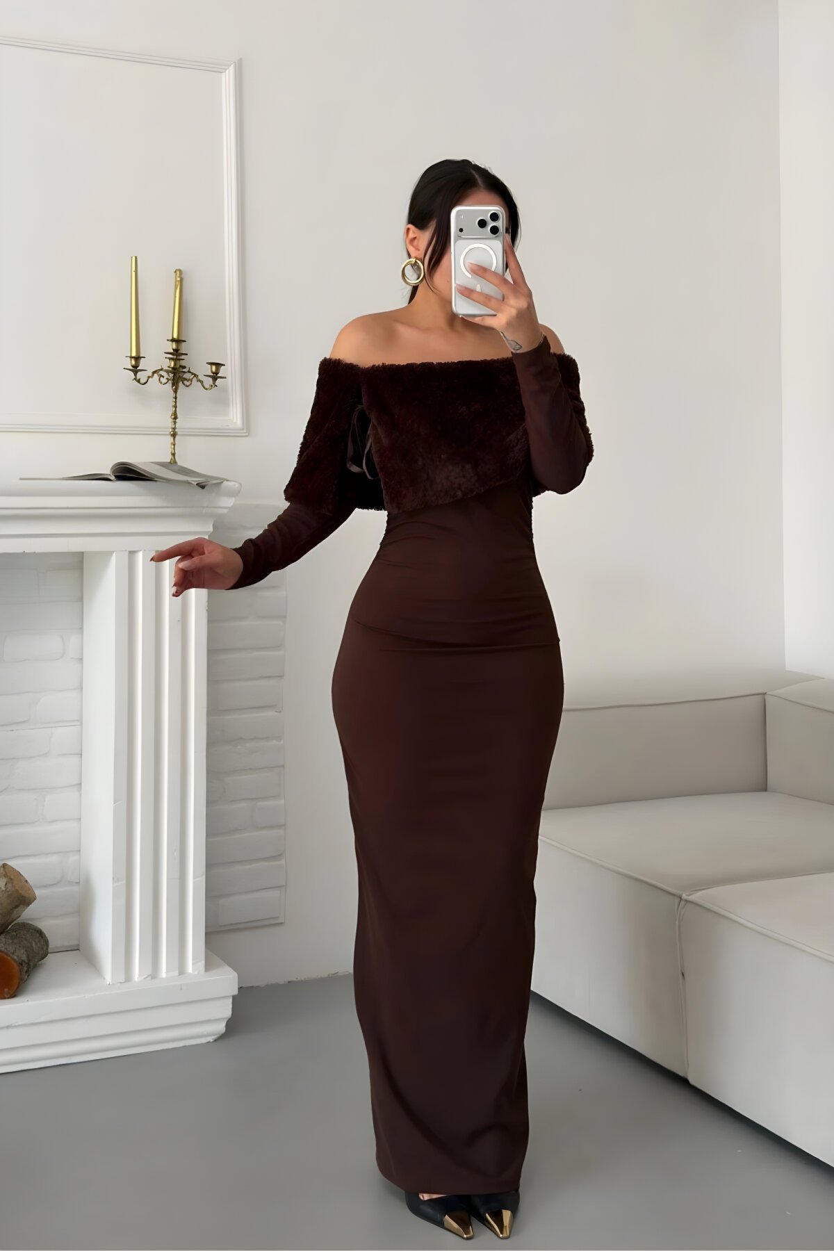 MOZENA Long Faux Fur Dress with Madonna Neckline in Brown