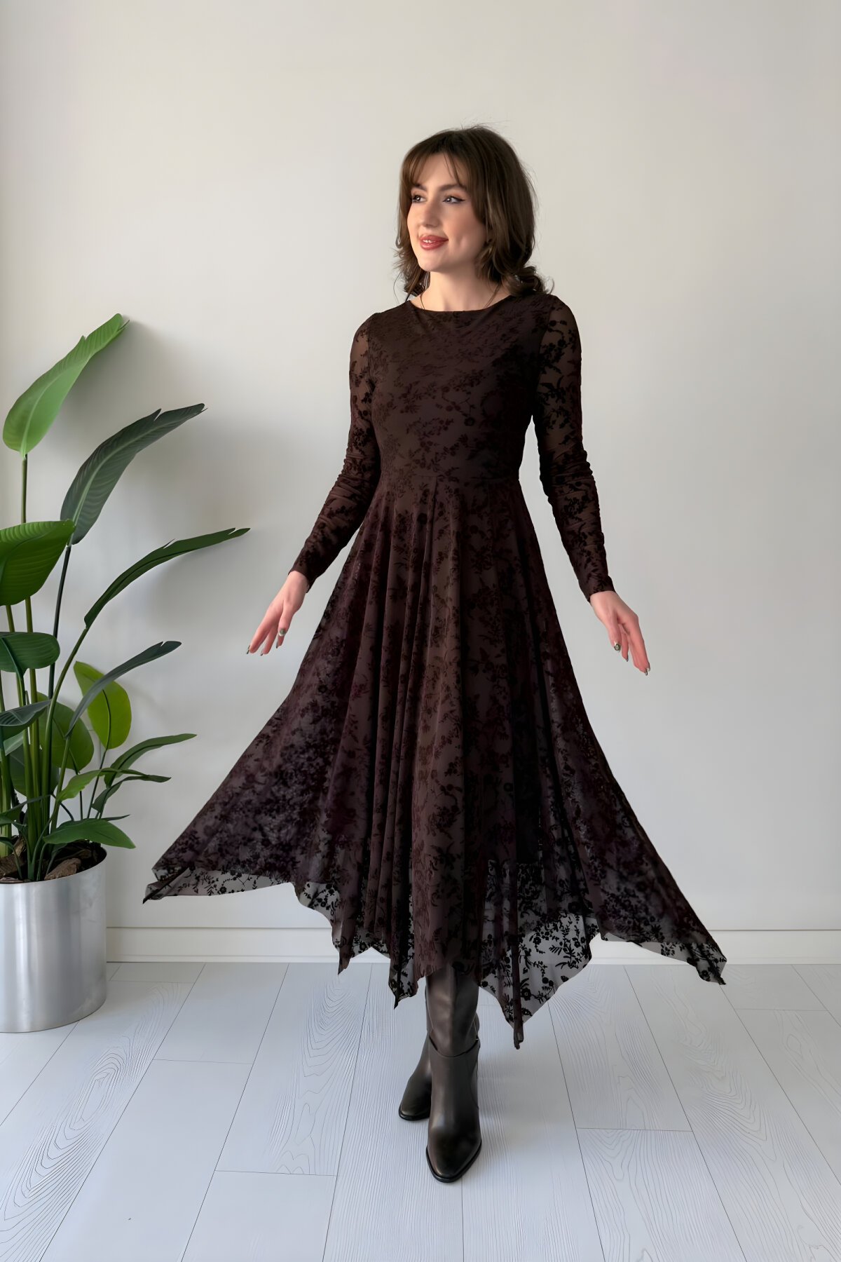 Discover the elegant MOZENA Brown Midi Asymmetrical Dress at MegaButik. This stunning piece features intricate floral embroidered lace and a flattering boat neck design. Perfect for special occasions, the unique cut ensures you stand out with sophisticated style. Shop now for trendy women's apparel.