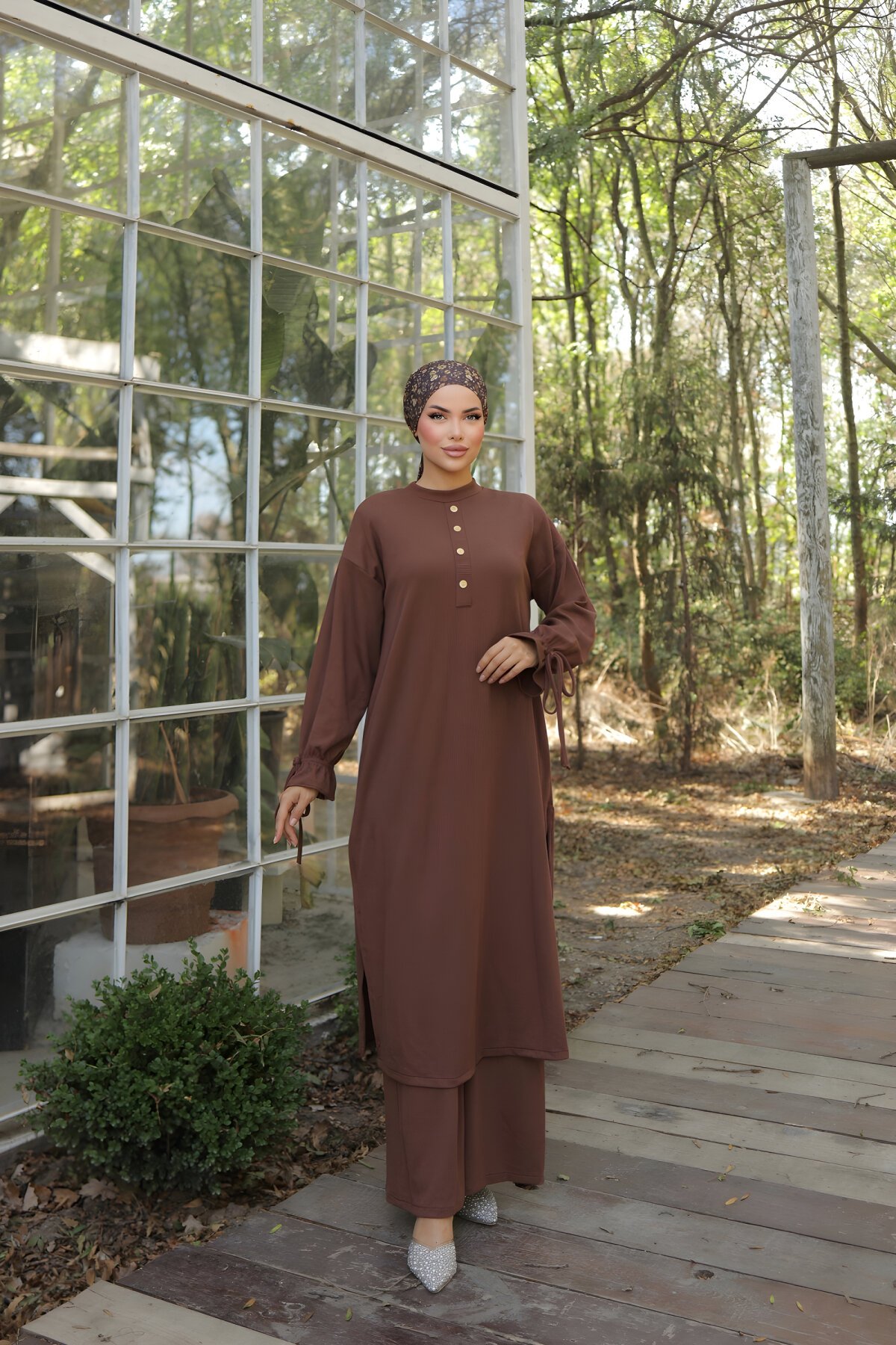 Discover the latest modest fashion trends at MegaButik. This stylish Nissra Modest Knit Two-Piece Set features elegant button details and comes in a rich dark brown color. Perfect for sophisticated daily wear, offering exceptional comfort and style.