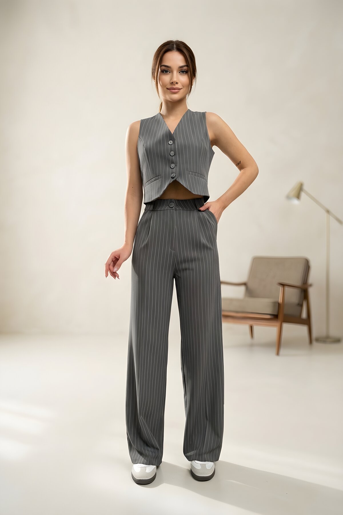 RAWEA FASHİONGray Striped Lined Vest and Palazzo Trousers Set