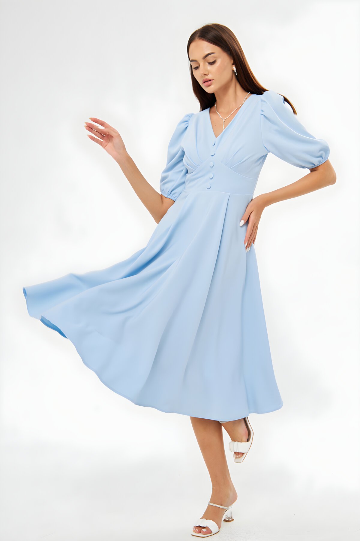BidoluelbiseKorsaj Kemer Detaylı, Balon Kol ve V Yaka Bebe Mavisi Midi Abiye Elbise