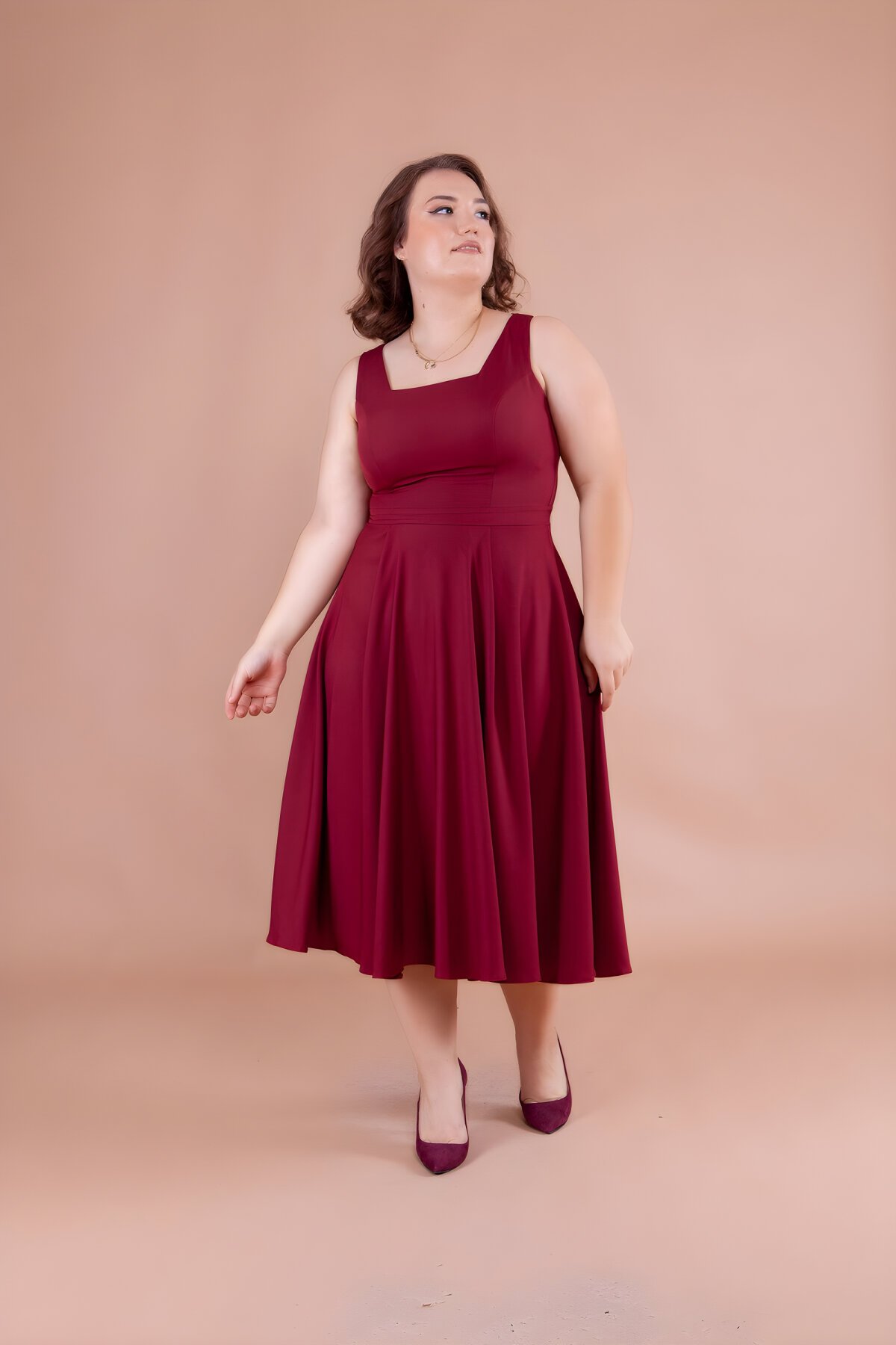 BidoluelbiseBüyük Beden Bordo Kare Yaka Midi Elbise