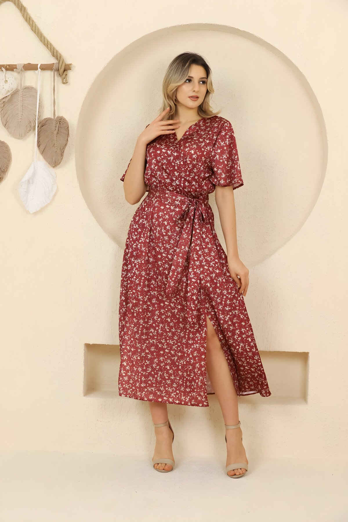 BidoluelbiseBordo Çiçek Desenli Kısa Kollu Kruvaze Yaka Kemerli Saten Midi Elbise