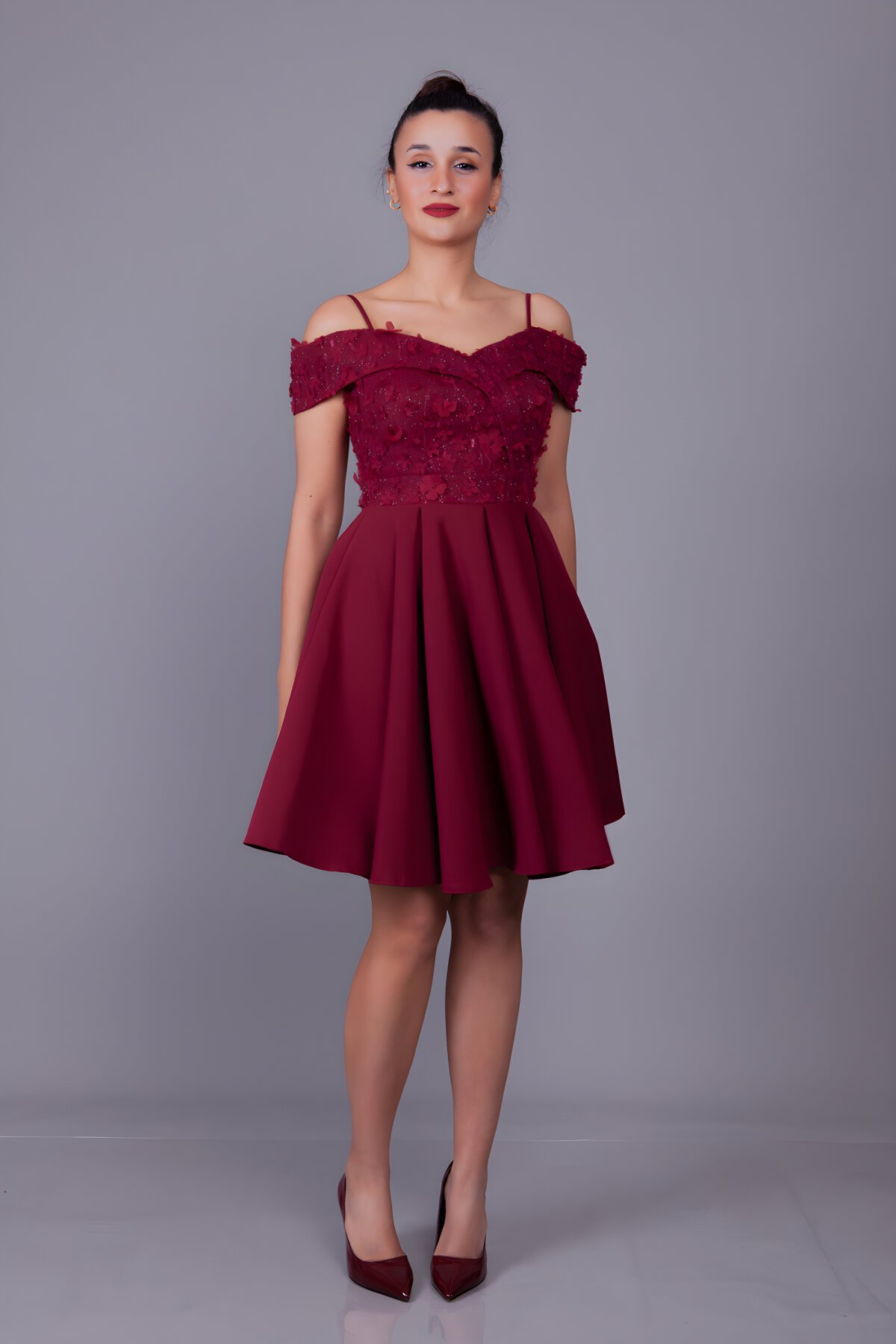 BidoluelbiseDüşük Omuz Askılı Mini Kloş Çiçekli Tül Detay Bordo Abiye Elbise