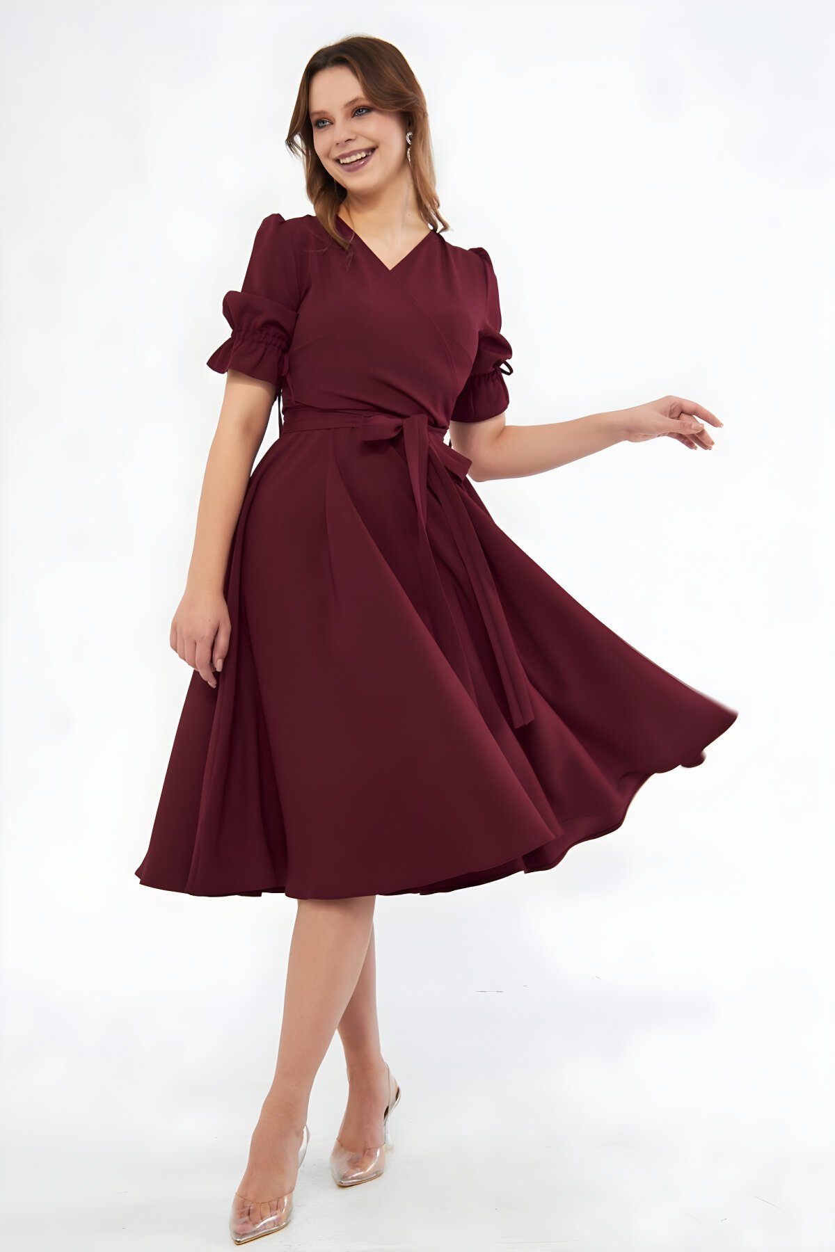 Kruvaze Yaka Midi Boy Büzgülü Kuşaklı Kısa Kol Bordo Abiye Elbise