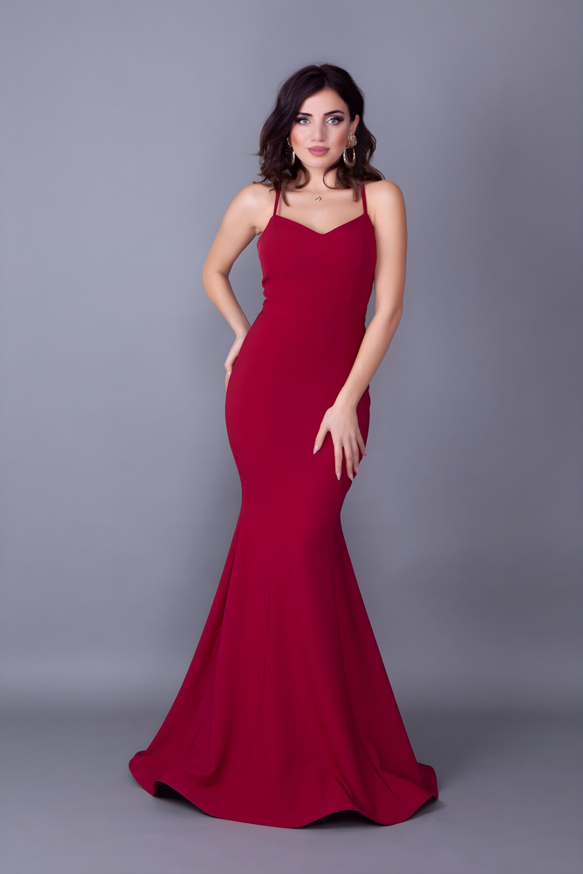BidoluelbiseBordo Uzun Balık Model Sırtı İp Bağlamalı Straplez Askılı Abiye Elbise