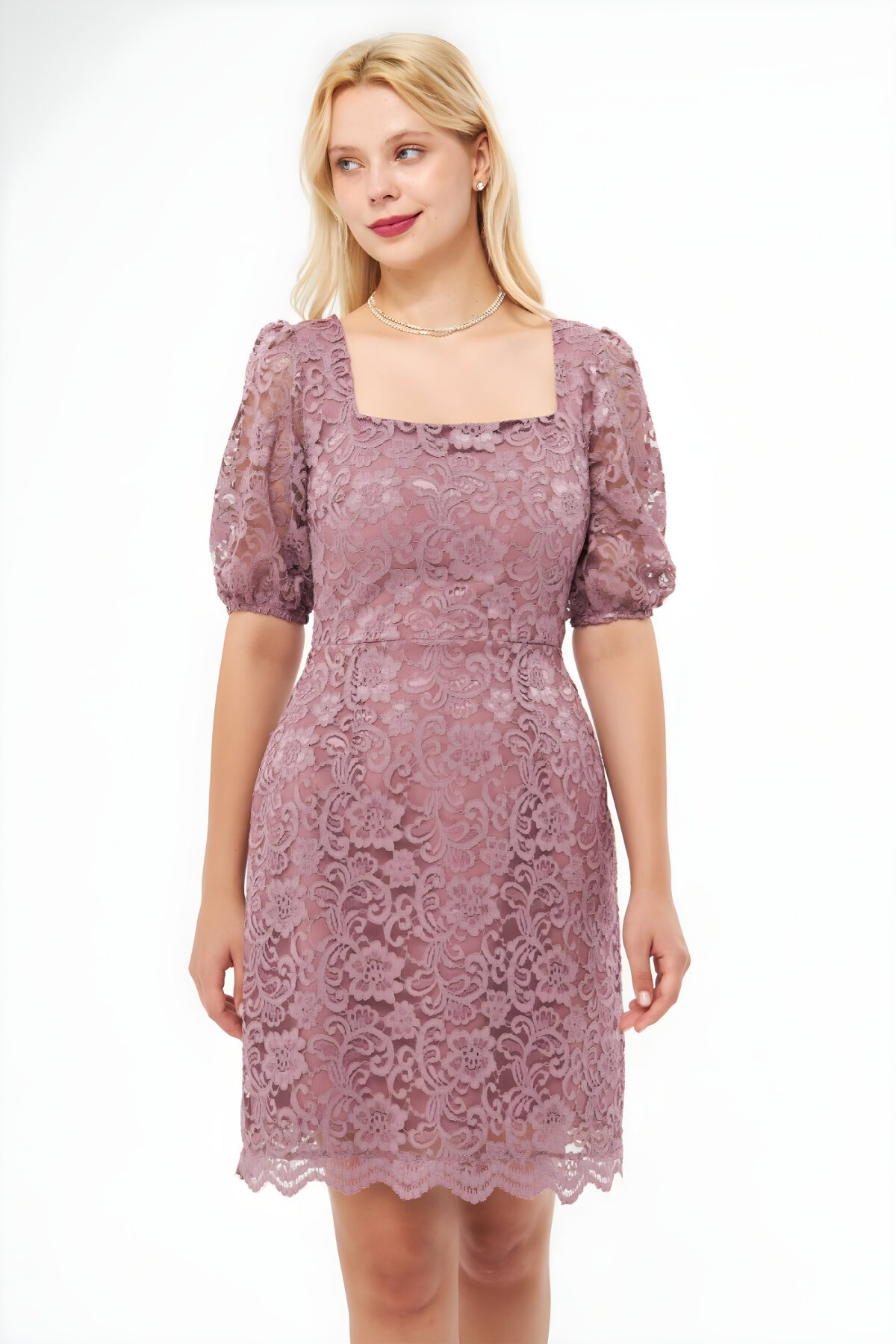 BidoluelbiseGül Kurusu Balon Kol Kare Yaka Fransız Dantel Mini Abiye Elbise