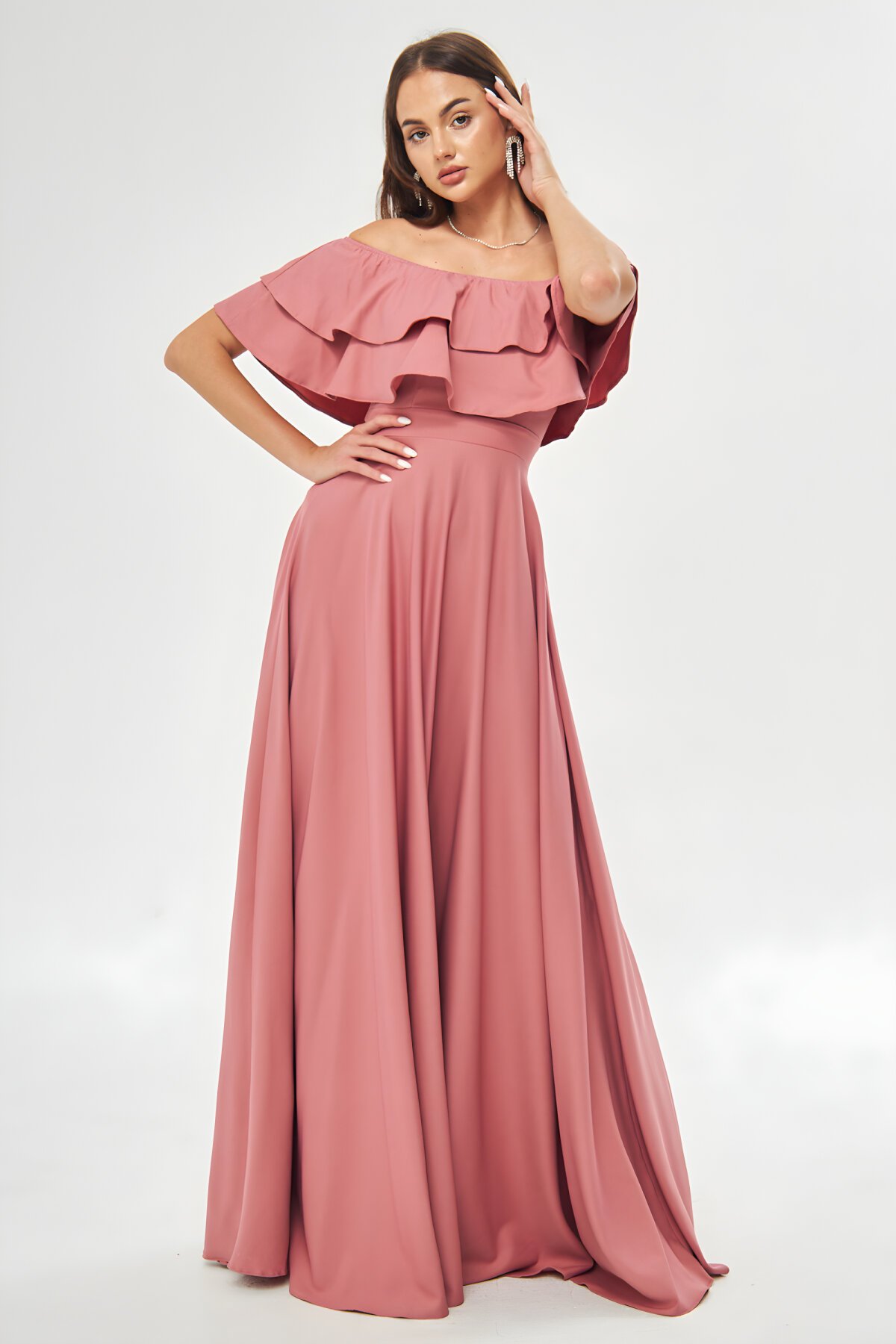 BidoluelbiseGül Kurusu Rengi Uzun Kloş Abiye Elbise Düşük Omuz Çift Kat Fırfır Detaylı Yaka