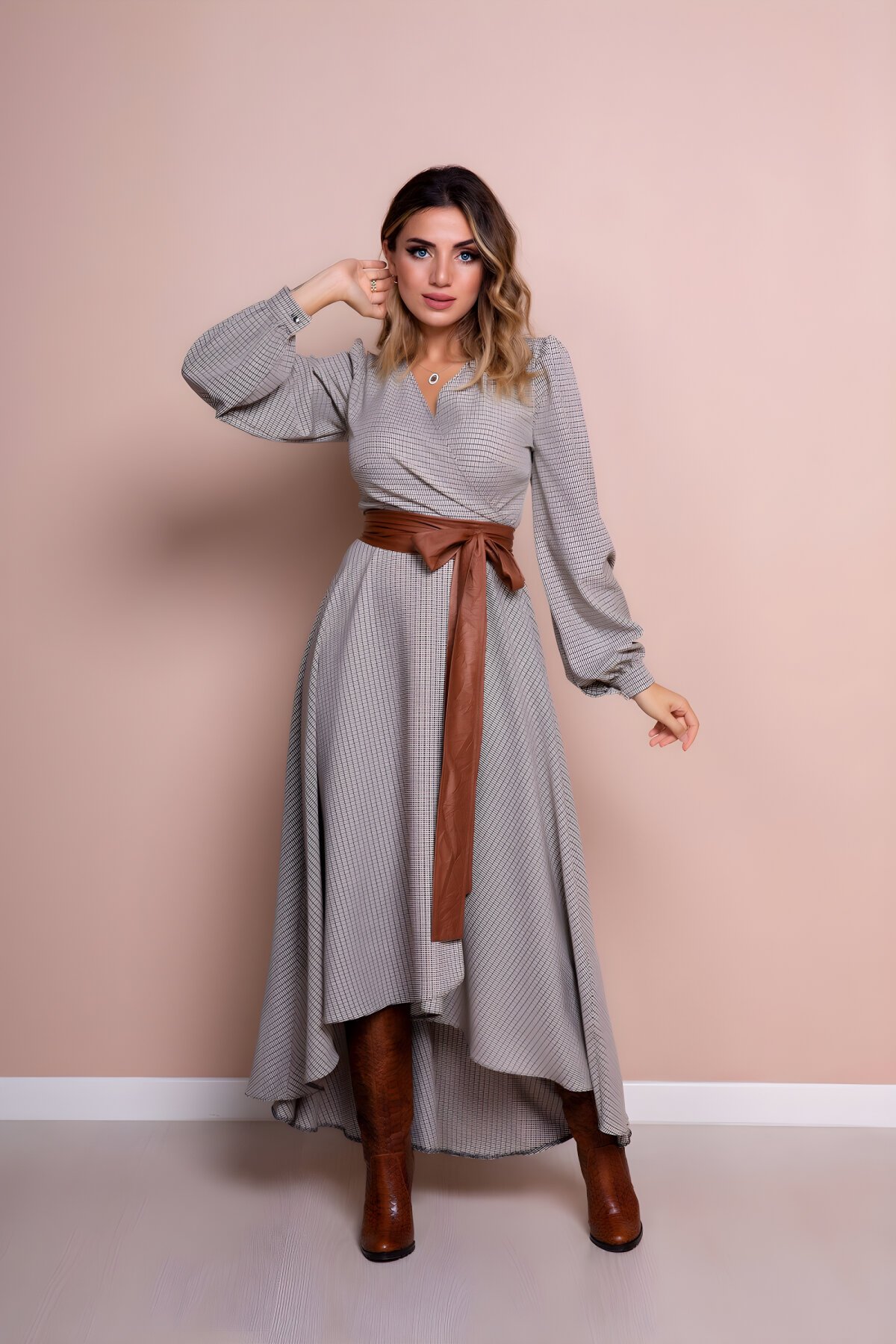 BidoluelbiseTaba Deri Kemerli Krem Siyah Vizon Ekose Uzun Kol Asimetrik Kesim Elbise
