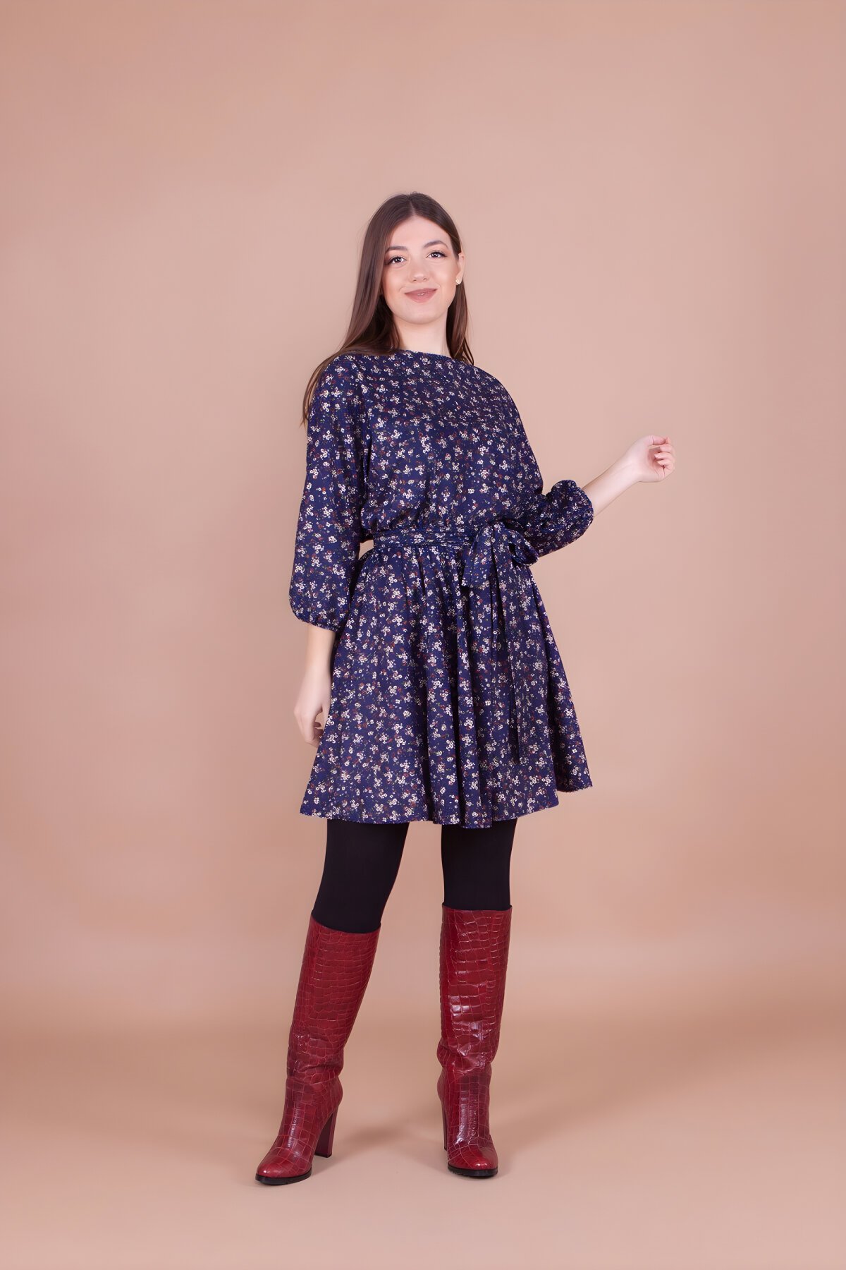 - Göz alıcı lacivert kadife kumaş üzerine serpiştirilmiş narin çiçek desenleri, elbiseye derinlik ve romantik bir hava katarken, soğuk aylara sıcak bir dokunuş getiriyor.