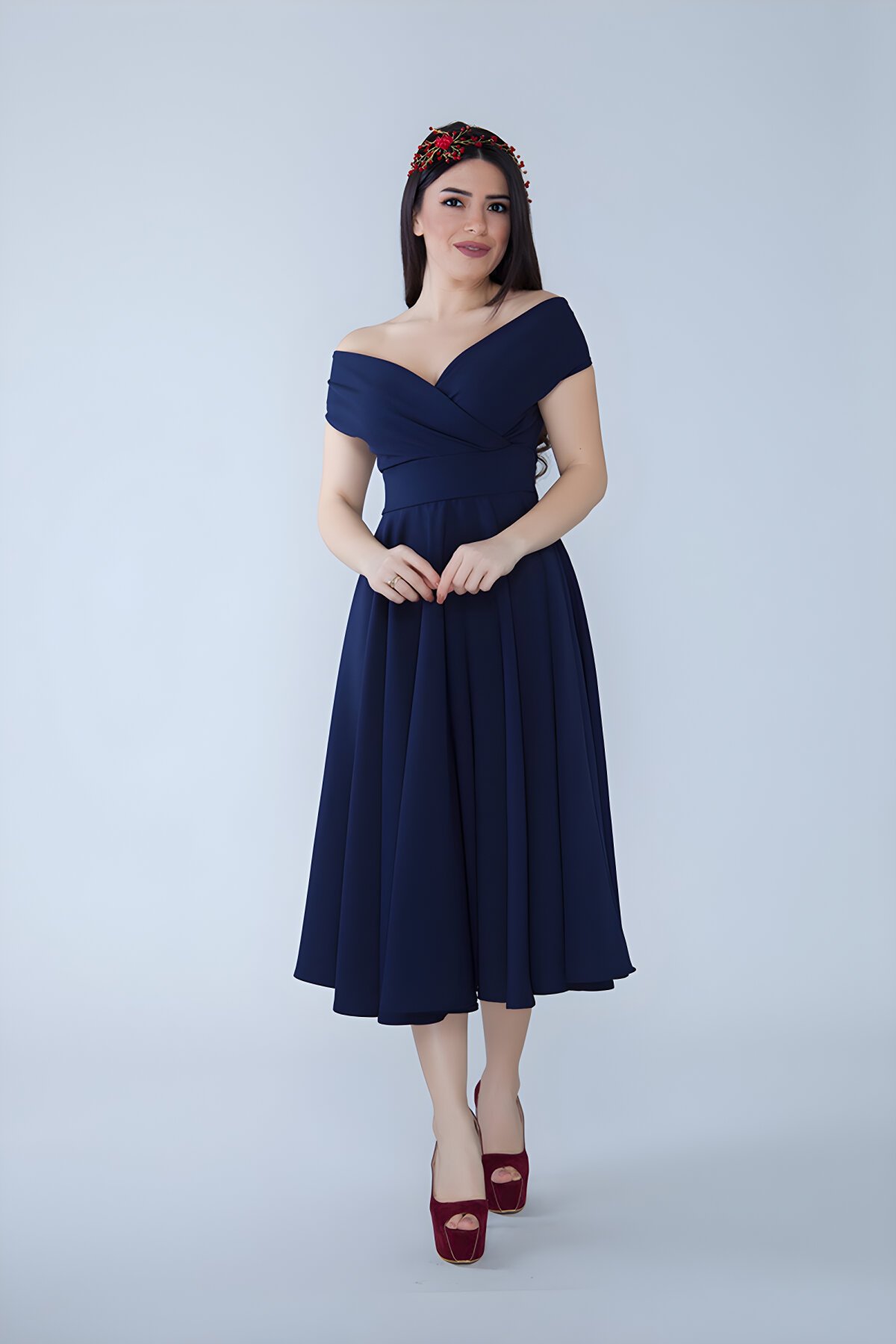 BidoluelbiseKayık Yaka Detaylı Dökümlü Kumaş Lacivert Midi Kloş Elbise