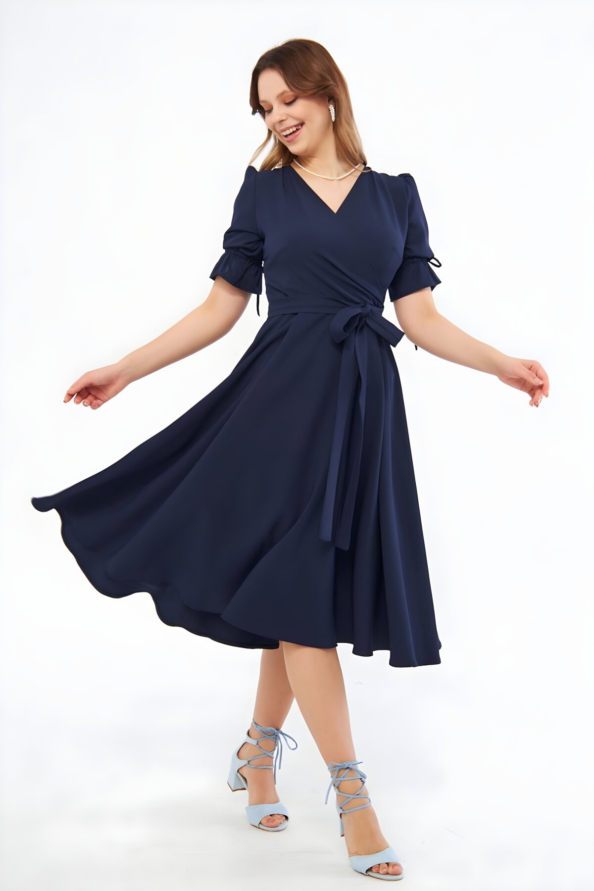 Bidoluelbise Kuşaklı ve Büzgülü Detaylı Lacivert Kruvaze Yaka Midi Elbise