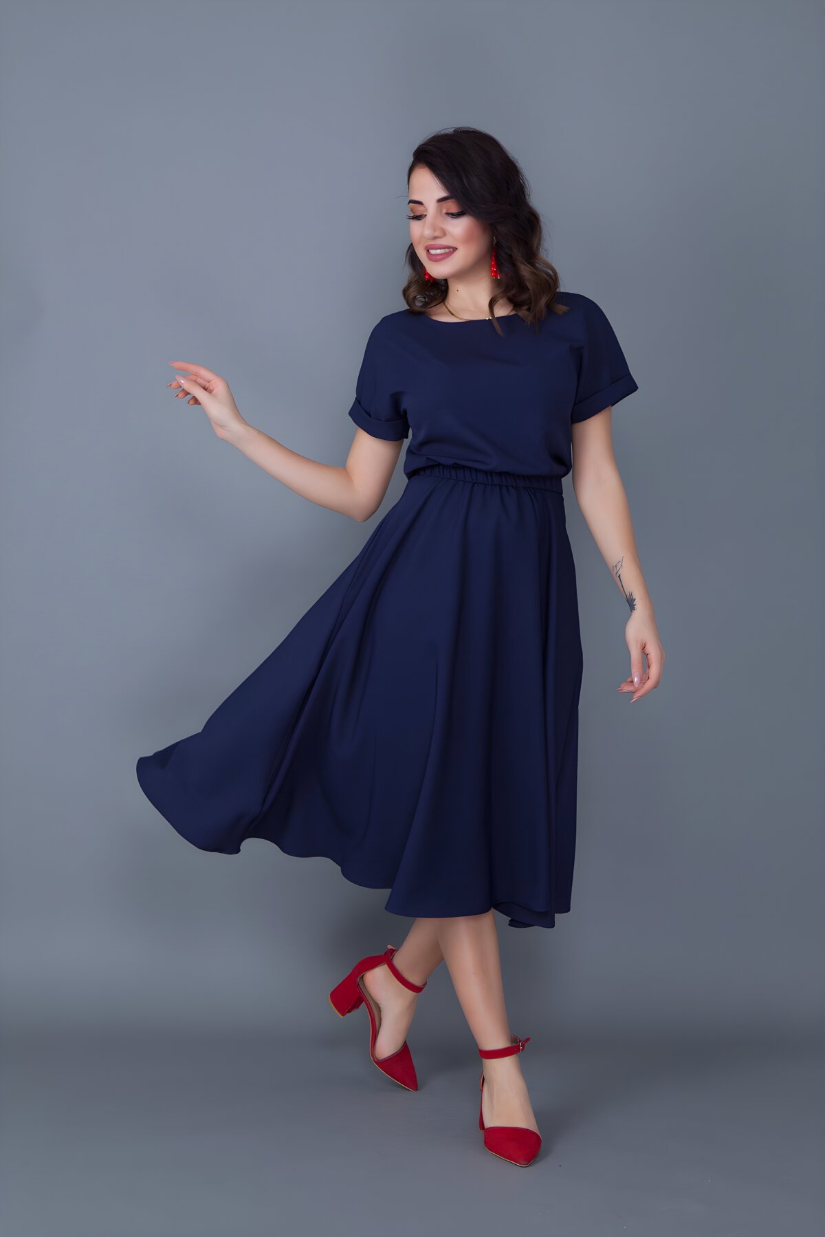 BidoluelbiseBeli Lastikli Cepli Lacivert Yarasa Kol Midi Elbise
