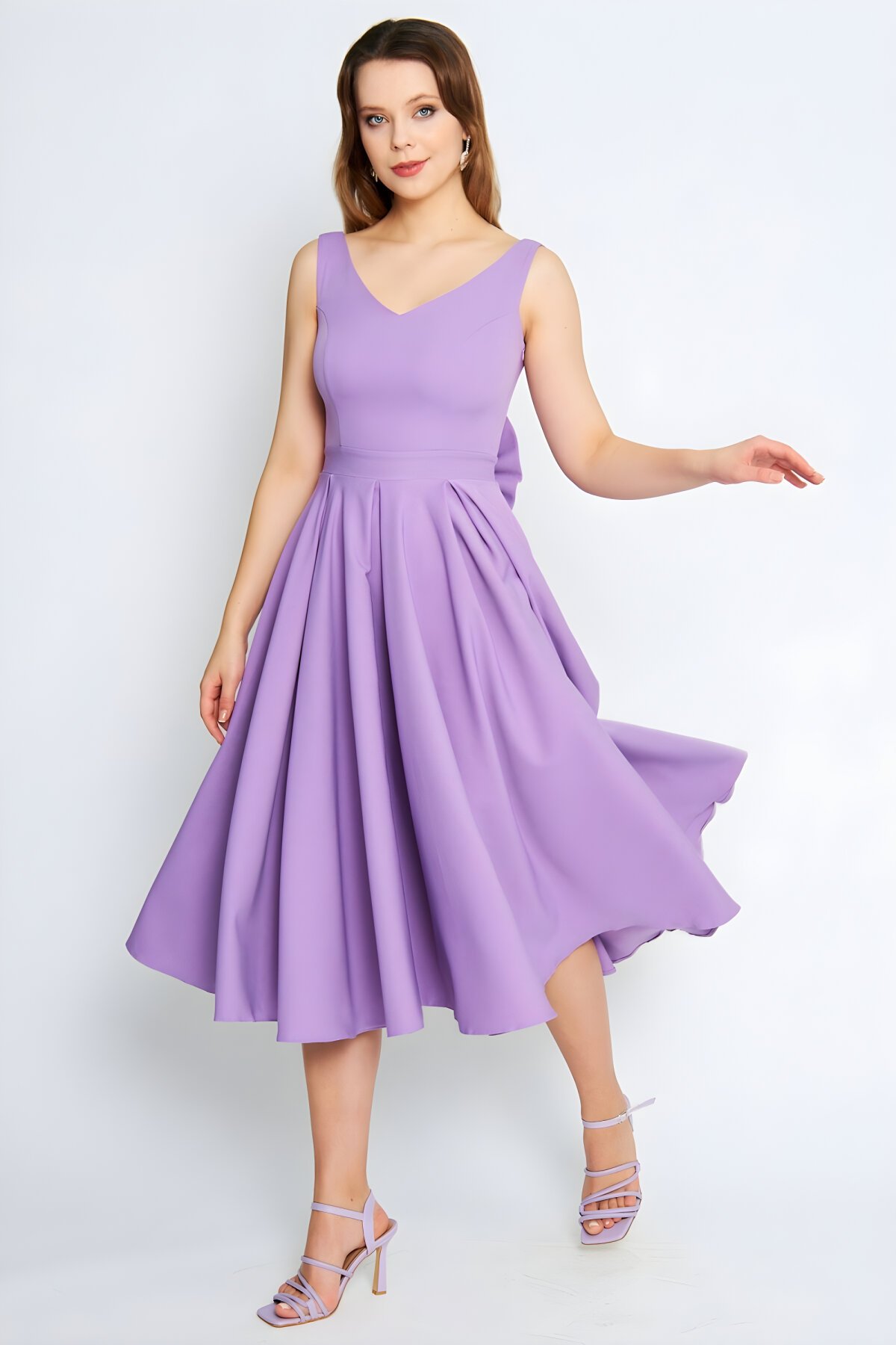 BidoluelbiseLeylak Rengi V Yaka Pileli Kloş Midi Abiye Elbise, Sırtı Fiyonk Detaylı