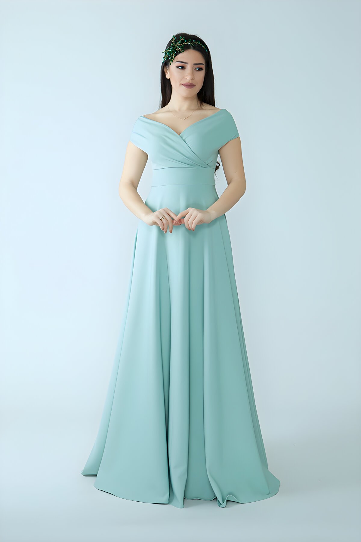BidoluelbiseMint Yeşili Kayık Kruvaze Yaka Düşük Omuz Detaylı Uzun Abiye Elbise