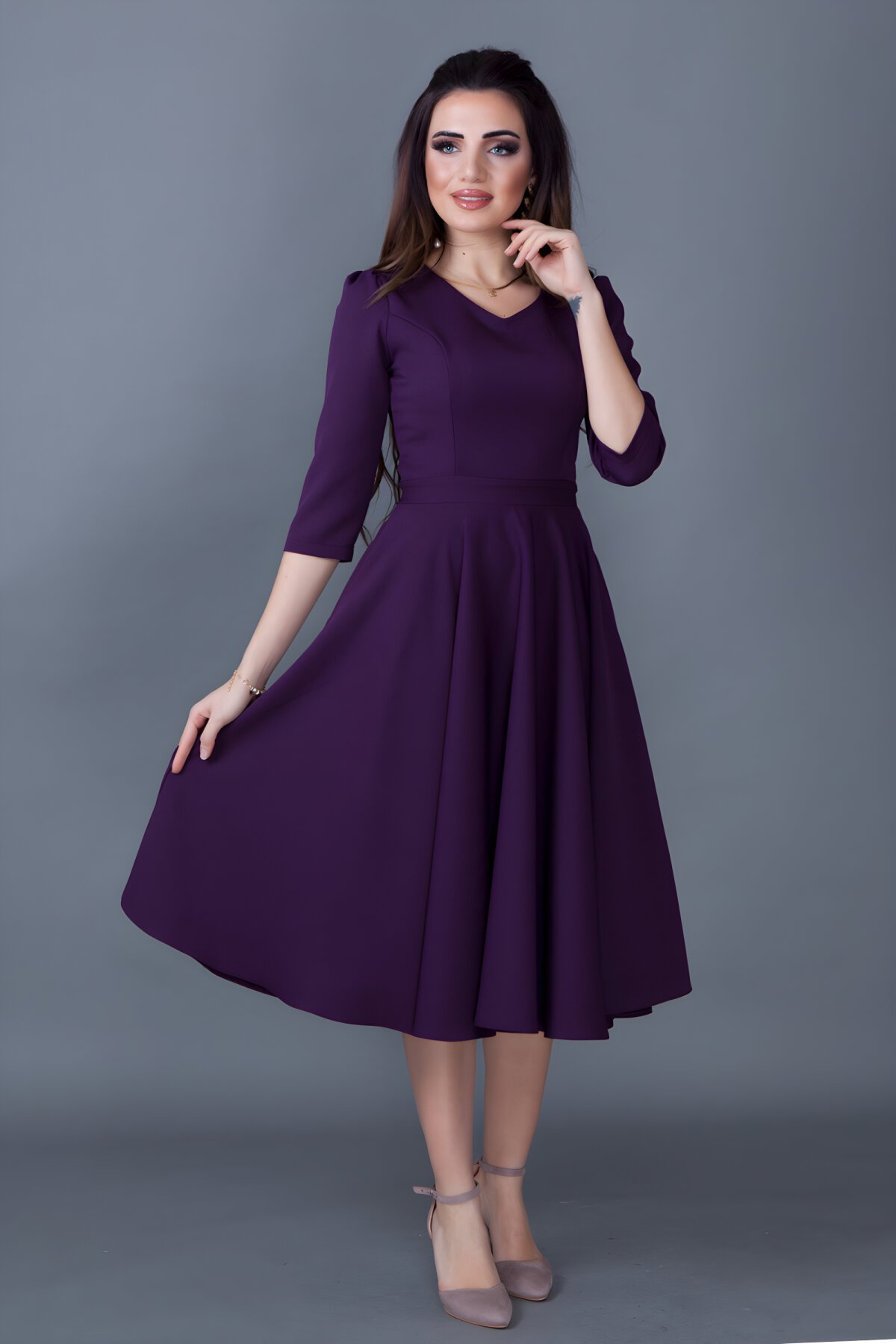 BidoluelbiseV Yaka Cep Detaylı Mürdüm Kloş Midi Elbise