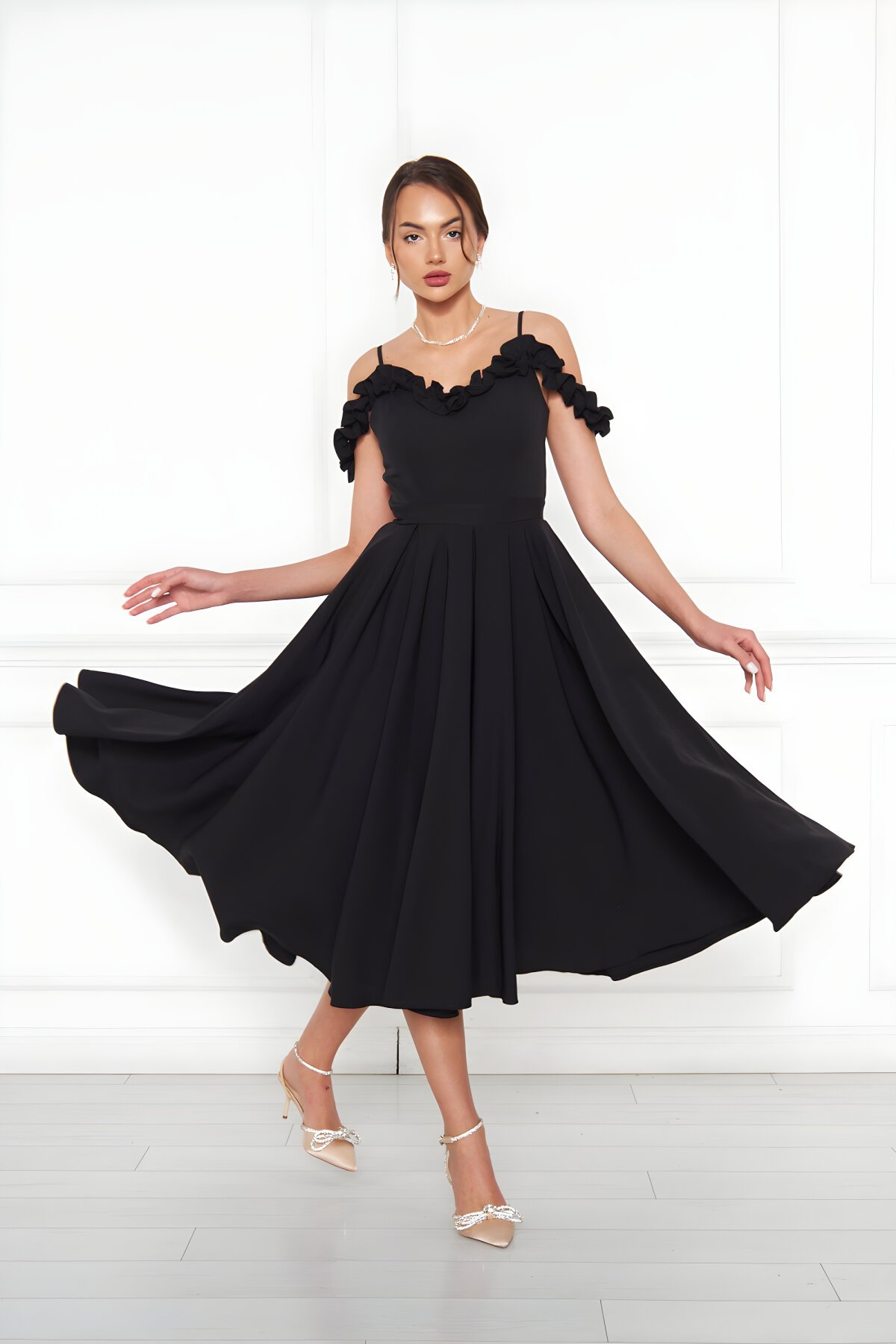 BidoluelbiseAyarlanabilir Askılı ve Yaka Fırfır Detaylı Siyah Midi Pileli Kloş Abiye Elbise