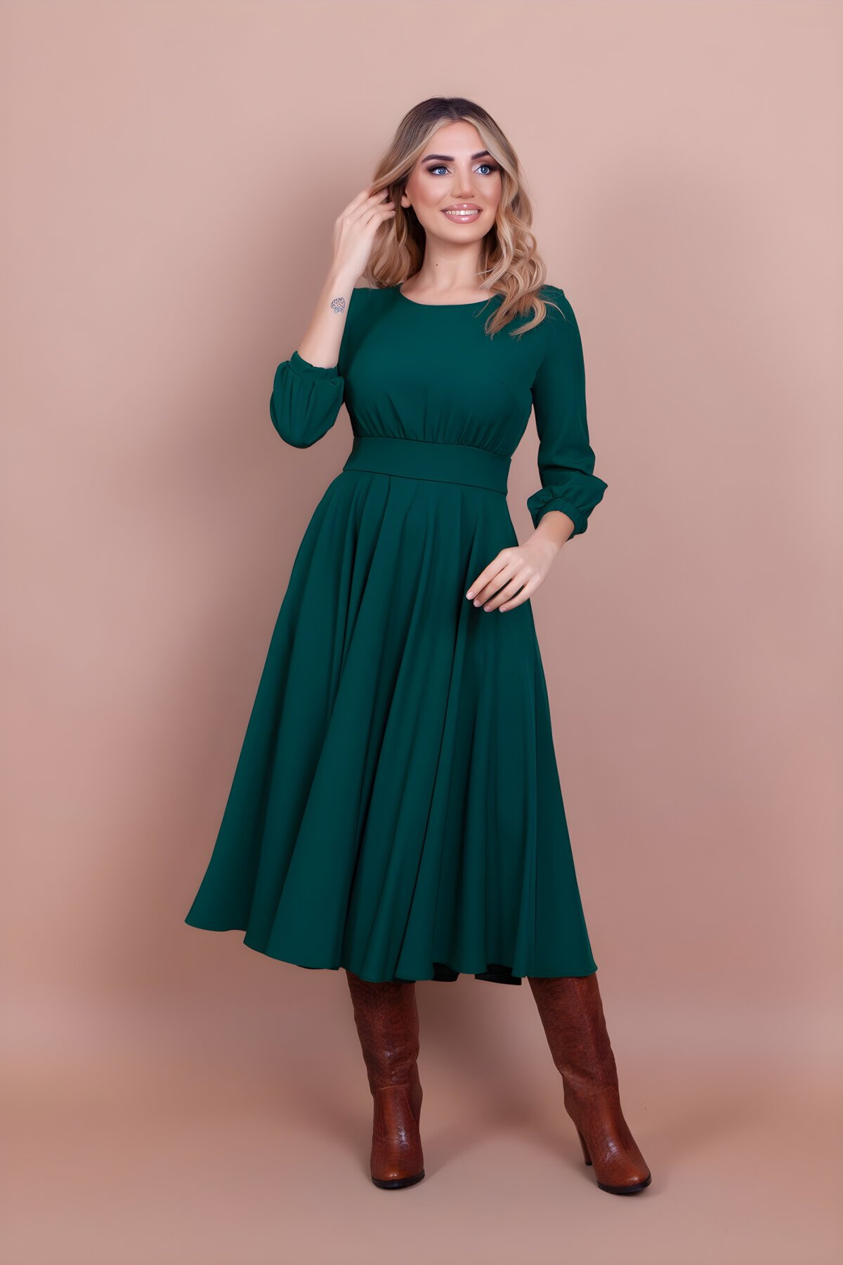 BidoluelbiseZümrüt Cep Detaylı Yuvarlak Yaka Midi Elbise