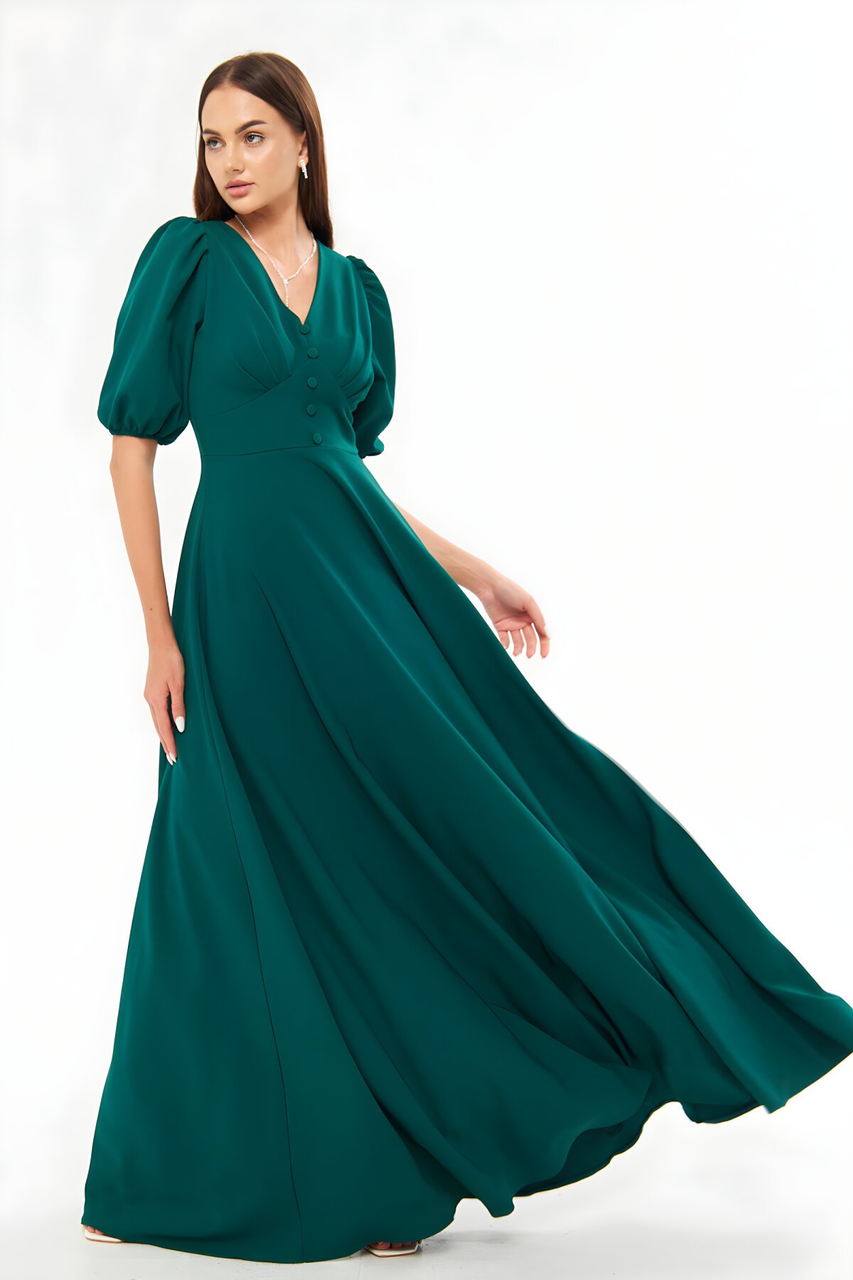 MegaButik'in en yeni koleksiyonundan: Zümrüt rengi uzun abiye elbise ile özel davetlerde tüm gözleri üzerinize çekin. Bu göz alıcı tasarım, balon kol, şık V yaka ve vücudu saran korsaj kemer detayı ile zarafetinizi tamamlar. Göğüs pileleri ve dökümlü kumaşı sayesinde konforlu ve etkileyici bir görünüm sunar. Bidoluelbise kalitesiyle hemen keşfedin!