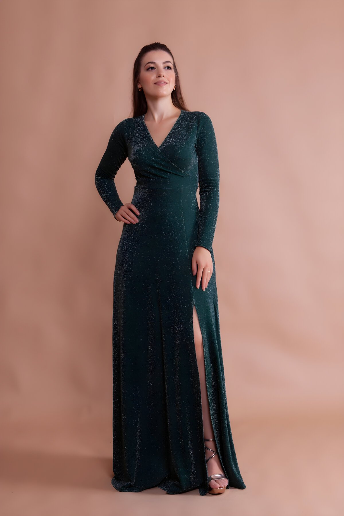 MegaButik'in en şık abiye elbise koleksiyonundan! Zümrüt rengi, uzun, simli ve esnek kumaşıyla gece davetlerinde tüm gözleri üzerinize çekin. Kruvaze yaka ve yırtmaç detayı ile modern bir görünüm sunan bu Bidoluelbise tasarımı, mezuniyet ve özel günler için idealdir.